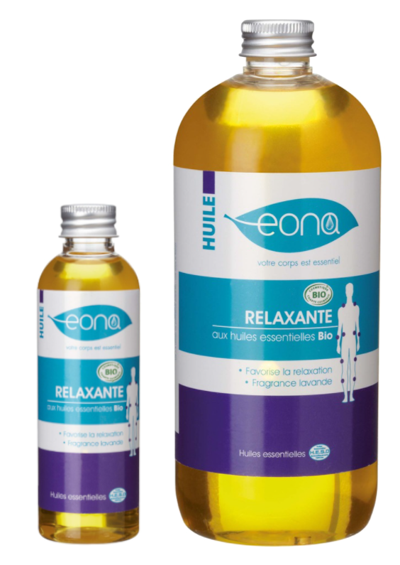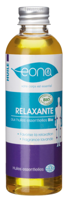 El aceite de masaje relajante Bio Eona se presenta en un frasco de vidrio ámbar para proteger los aceites esenciales de la luz y preservar sus propiedades. También está equipado con un tapón con sistema de goteo para un uso higiénico y económico.