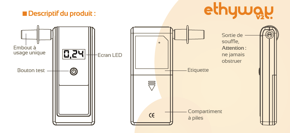 El alcoholímetro electrónico Ethyway V2 está equipado de un sensor electroquímico de 11 mm. El Ethyway versión 2 vuelve con mejores características que le garantizarán una gran fiabilidad de resultados. Ya sea un particular, una empresa, un lugar de fiestas...el Ethyway V2 le permitirá controlar en todo momento su nivel de alcohol en aire espirado por medio de un soplido a través del alcoholímetro. Este posee diferentes modos de visualización - opciones a escoger desde el momento en que adquiere el aparato - entre las cuales se encuentra una visualización que alcanza hasta 0,24 mg/L o una visualización hasta de 0,49 mg/L para uso médico o para pruebas de detección de alcohol únicamente. Se debe tener en cuenta que el límite de alcohol en aire espirado en España es de: 0,25 mg/L (0,15 mg/L para los profesionales y noveles).
