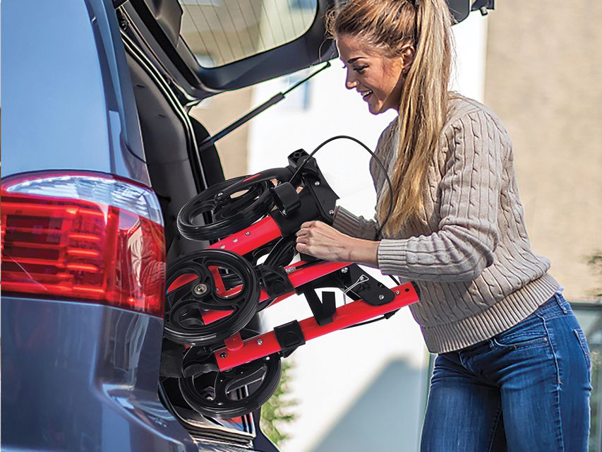 El andador Compact también es fácil de almacenar y transportar gracias a sus dos ruedas delanteras pivotantes y plegables, así como a sus dos patas traseras plegables. Esta característica permite reducir significativamente el tamaño del dispositivo para un almacenamiento sencillo en espacios reducidos.