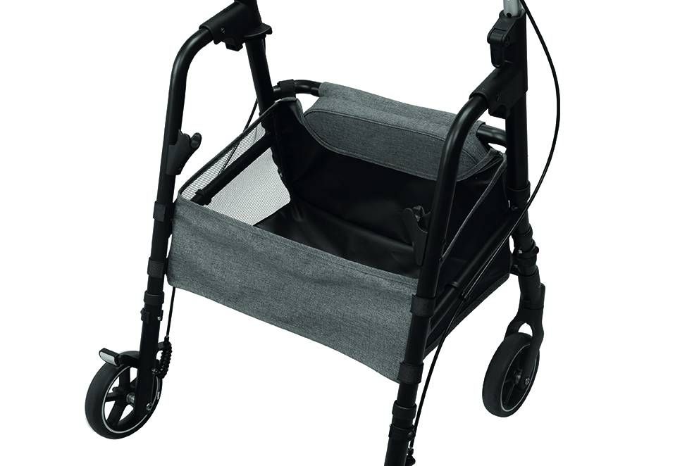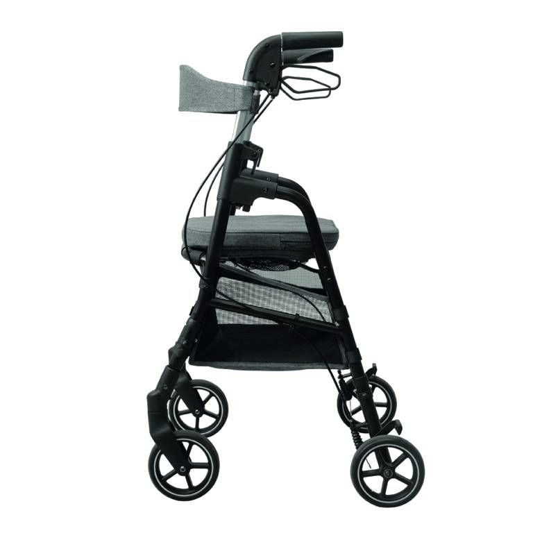 Las empuñaduras ergonómicas y regulables en altura (90-97 cm) garantizan el agarre adecuado para cada usuario. El sistema de frenado seguro garantiza una parada controlada y una estabilidad perfecta, reduciendo el riesgo de caídas.