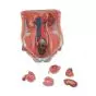 Una de las dos mitades anteriores del riñón es desmontable. Este modelo miniatura es complementado por 2 órganos genitales insertables, de 2 piezas respectivamente, que se pueden recambiar fácilmente. El masculino comprende la vejiga con la próstata y el femenino la vejiga con la matriz y los ovarios.