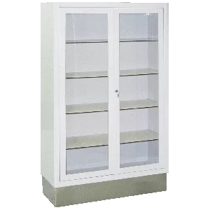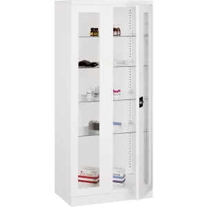 El armario Hidemar esta equipado de una puerta con cerradura a llave, cuatro estantes en vidrio, puertas en vidrio. Fabricado en acero esmaltado/epoxi. Dimensiones: 90x35x150cm