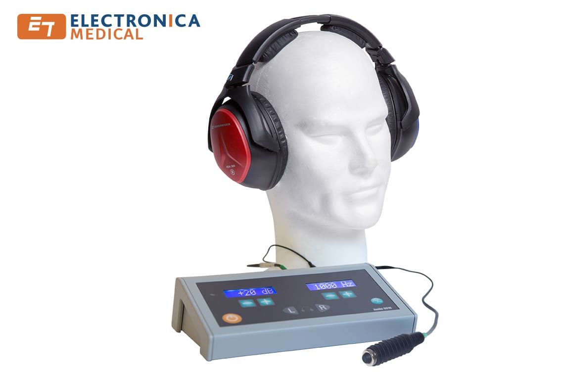 En cuanto a los auriculares de diadema, el audiómetro Electronica Medical 9910 posee dos versiones diferentes. La primera versión se encuentra disponible con unos auriculares Sennheiser estándar los cuales le proveen una alta calidad así como un aislamiento acústico. La otra versión en la que se encuentra disponible el aparato, contiene unos auriculares Sennheiser HDA 300, los cuales son unos audífonos especialmente diseñados para la audiometría. Estos permiten la práctica del examen con una eficacia óptima gracias a su alta frecuencia que garantiza mediciones más precisas con un rango de error mínimo. El aislamiento acústico es excelente y permite que se escuchen solamente las señales sonoras de la audiometría con el fin de que se eviten los sonidos del exterior.