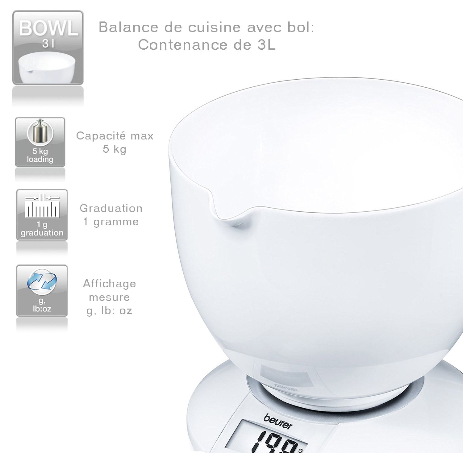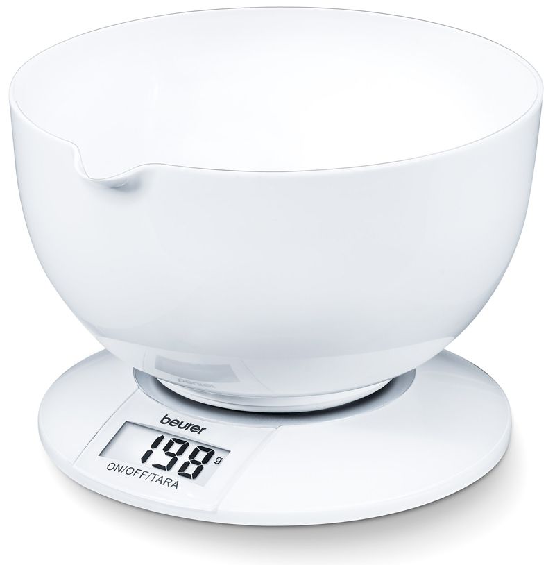 | - Requiere poco espacio: la balanza puede colocarse sobre el bol | - Bol grande de 3,0 litros lavable en lavavajillas, con pico y soporte circular antideslizante |