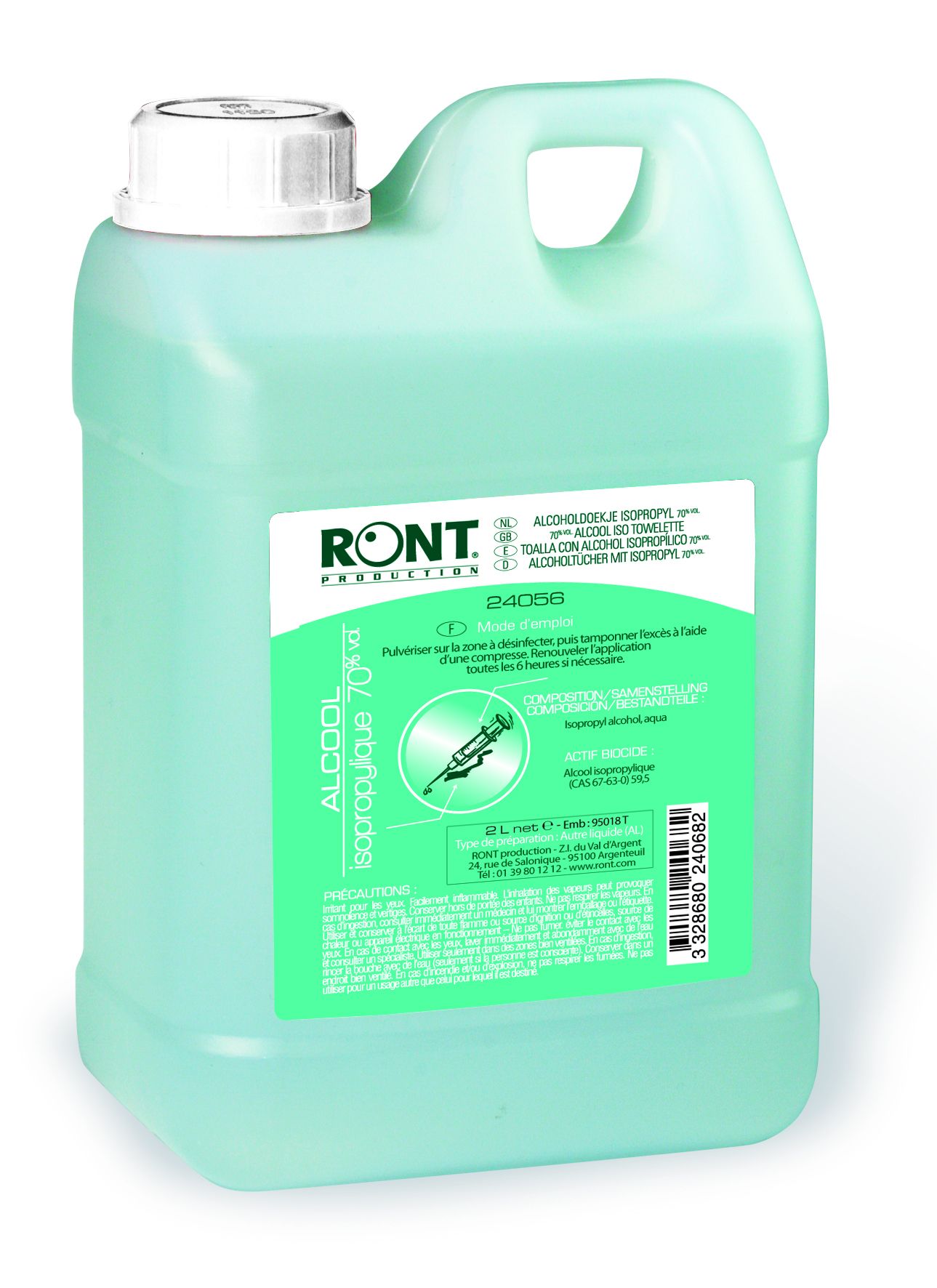 Barril 2 L alcohol 70% vol Ront - Sin gas - Alcohol isopropílico al 70% - Producto Biocida - Capacidad: 2 L