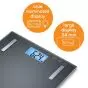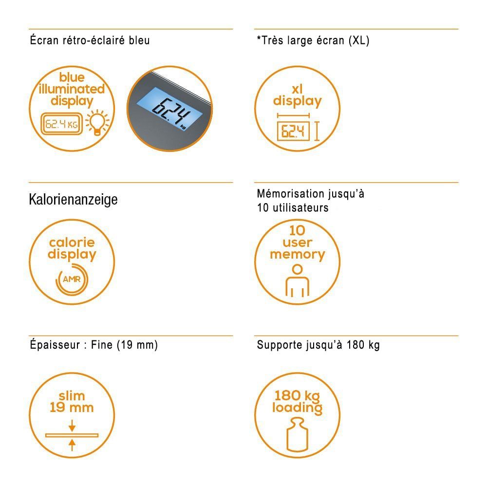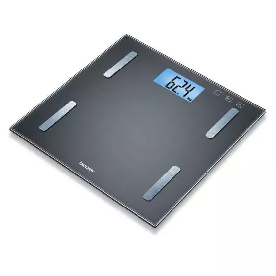 La báscula de peso de bioimpedancia Beurer BF 180 se encuentra dotada con una pantalla LCD XXL retro iluminada en color azul que le permite visualizar la medición de su peso, el índice de grasa corporal, el nivel de agua corporal e incluso el índice de masa ósea. Asimismo, este modelo de pesa con impedanciometría puede calcular su Índice de Masa Corporal (IMC) con el fin de que usted pueda obtener una idea clara del estado de su salud de acuerdo con los datos que ha medido de su cuerpo. La pesa persona posee cinco niveles de actividad configurables de manera individual. Usted tiene la posibilidad de almacenar hasta 10 memorias de mediciones con el objetivo que usted pueda realizar un seguimiento del progreso de su cuerpo comparando sus mediciones previas con las más recientes. Esto le permite observar y cuantificar el progreso de su cuerpo no solo en términos de su peso sino también en términos de otras mediciones corporales que pueden determinar si usted se encuentra en un estado de salud bueno. La báscula de bioimpedancia ha sido fabricada con una tecnología innovadora. En efecto, las nuevas funcionalidades le permiten utilizar este modelo de Beurer BF 180 de una forma más óptima. La tecnología de encendido rápido hace que su pesaje sea más efectivo ya que la pesa se enciende automáticamente en el momento en que usted se para sobre esta. Además, gracias a su base hecha en vidrio de seguridad, usted se verá beneficiado de una carga máxima de hasta 180 kg. Asimismo, usted tiene la ventaja de elegir el sistema de medición que mejor le convenga ya sea en Kg, Lb o en st.
