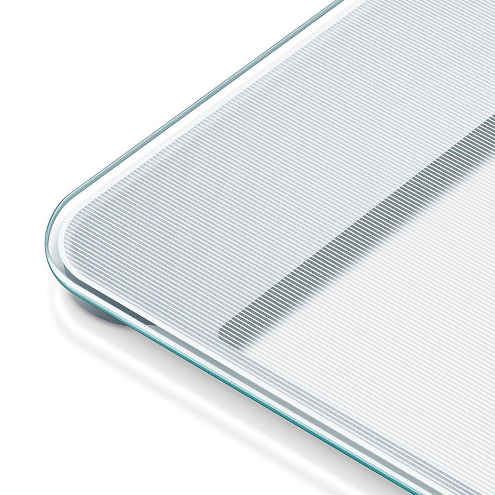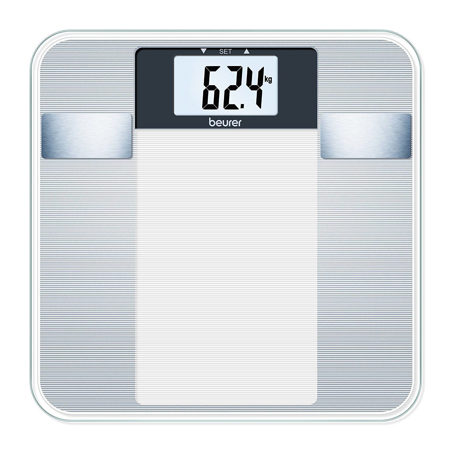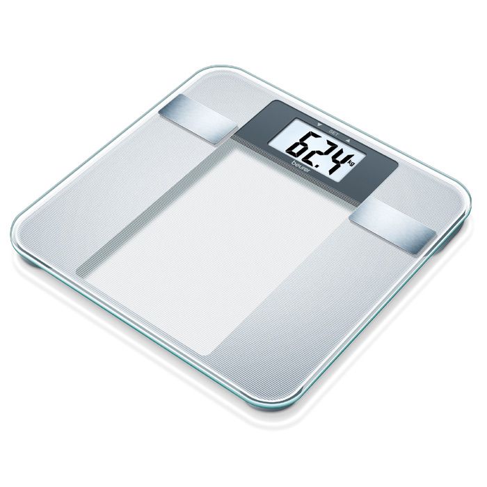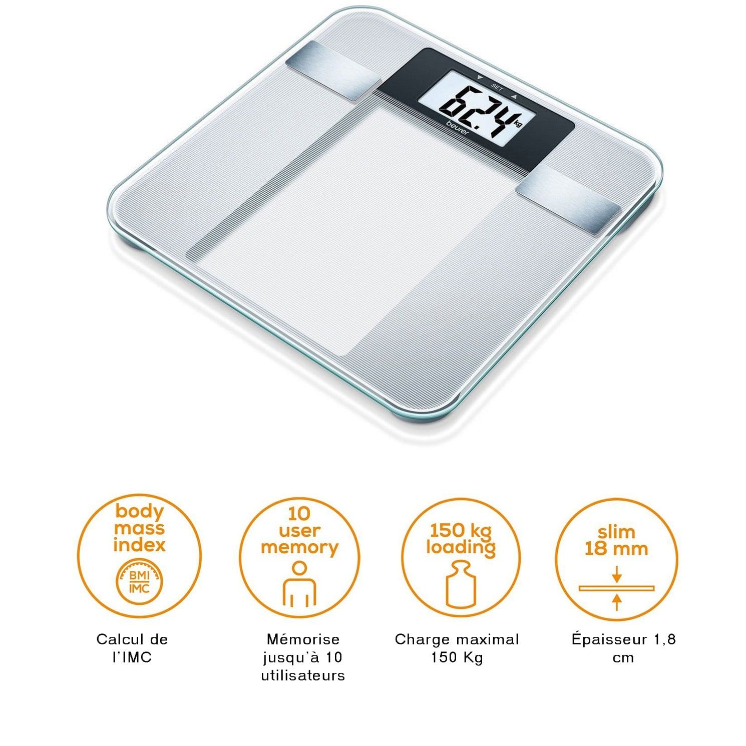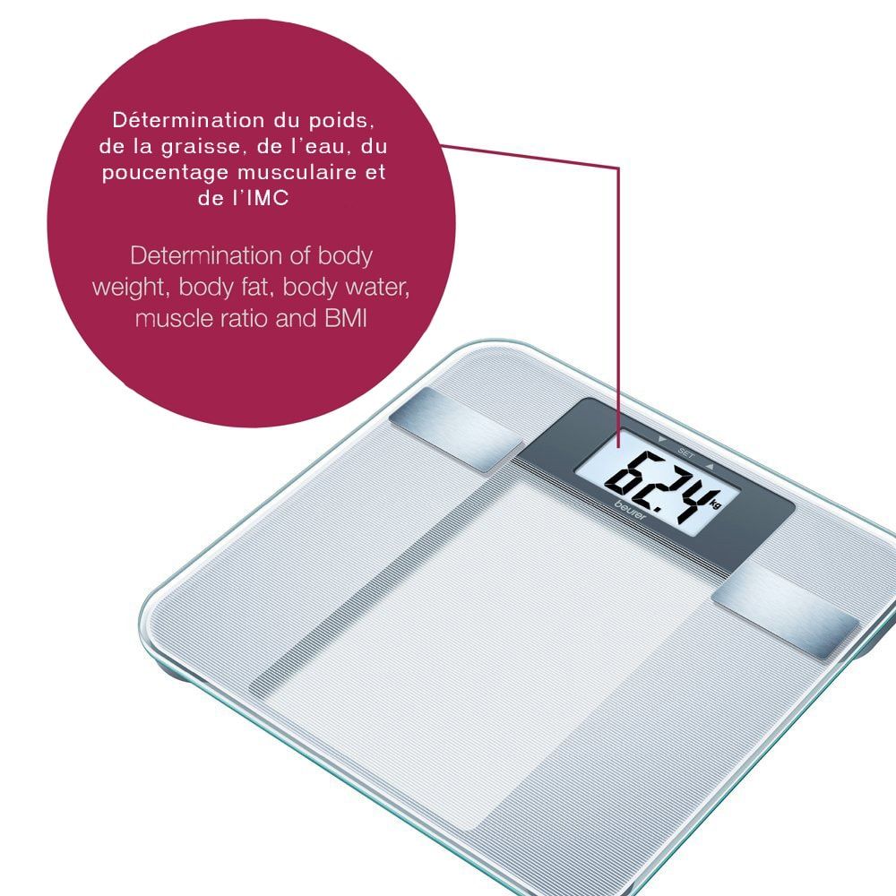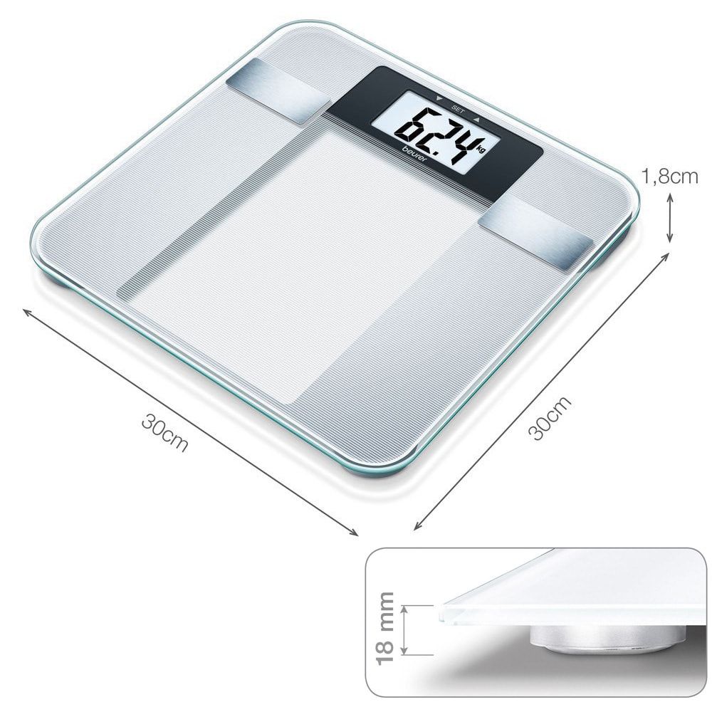 Báscula diagnóstica de vidrio Beurer BG 13 - Vidrio de seguridad - Amplia superficie de pesaje - Soporta hasta 150 kg - Electrodos en acero inoxidable cepillado - Pantalla LCD - Tamaño de los números : 38 mm - Nivel de actividades : 5 - Garantía : 5 años