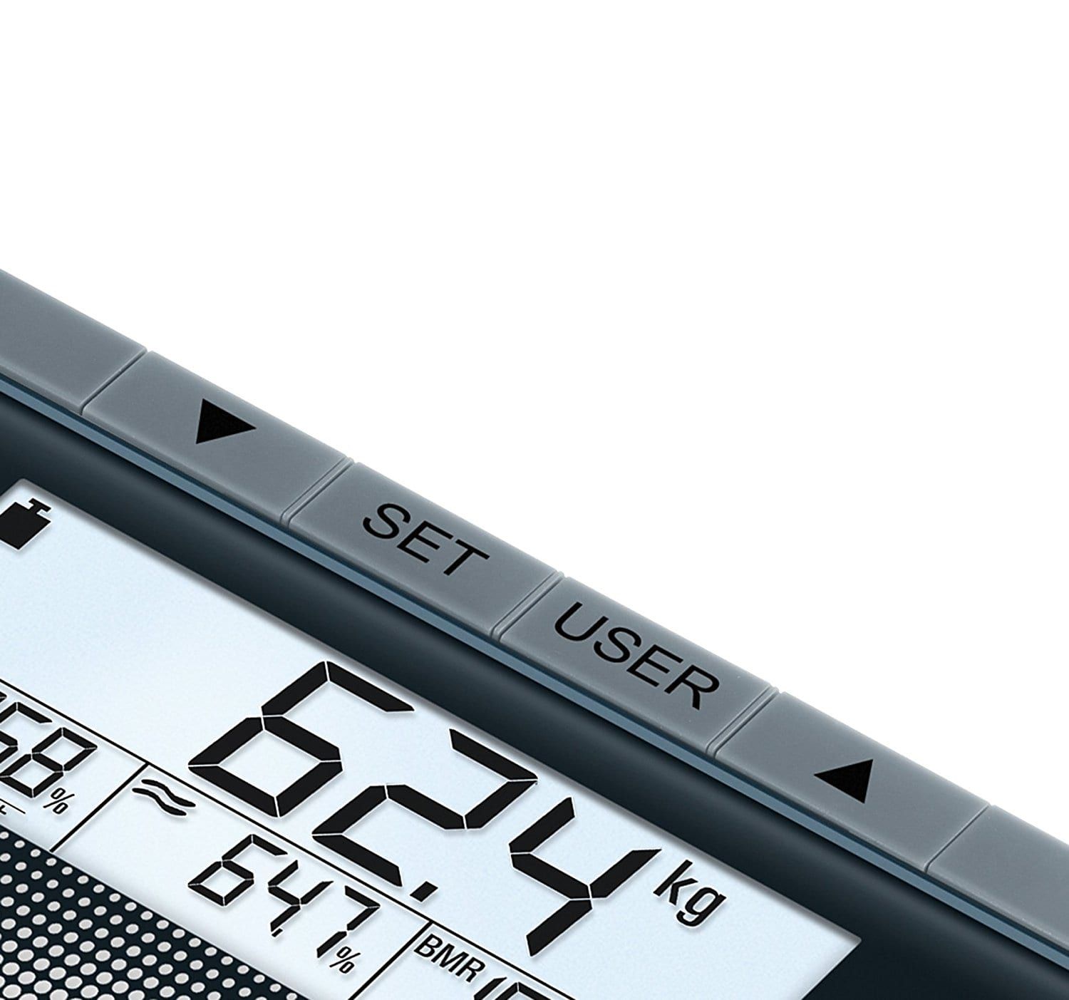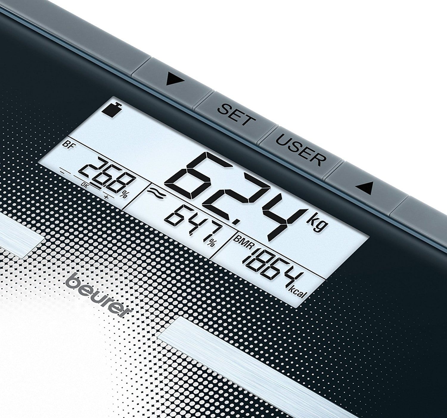 La Báscula diagnóstica de vidrio Beurer BG 21 calcula las medidas siguientes : peso, grasa corporal, agua corporal, masa muscular, masa ósea
