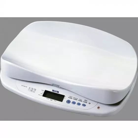 La báscula pesabebés TANITA BD 815 MA está específicamente diseñada para el pesaje de los bebés y los bebés prematuros. Se puede grabar pequeños cambios en el peso medido por la graduación de 2 g (hasta 6 kg) y la graduación 5 g (hasta 15 kg).