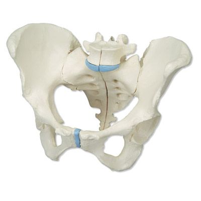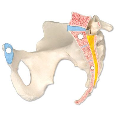 Modelo en tres piezas representando un molde original de la estructura ósea de una pelvis femenina, mostrando todos los detalles de las estructuras anatómicas: dos huesos ilíacos, la sínfisis púbica, el sacro y el coxis, la quinta vértebra lumbar con el disco intervertebral. Una sección media sagital a través de la quinta vértebra lumbar, sacro y coxis, permite desmontar las dos mitades de la pelvis, mostrando una parte de la cauda equina en el canal vertebral. La mitad izquierda de la quinta vértebra lumbar es desmontable.
