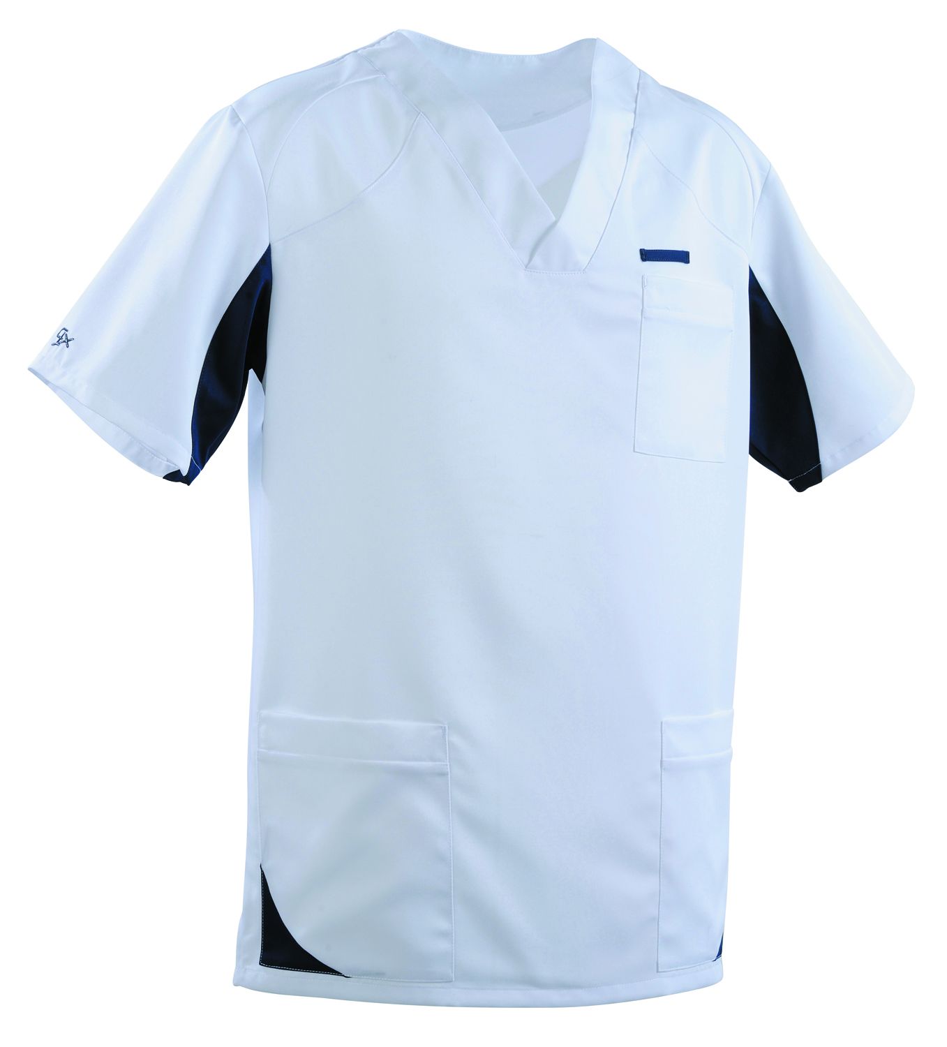 Bata de medico hombre SANDRO Clemix 2.0 Lafont blanco / azul marino - Cuello con escote en V - Mangas cortas - Tejido: Sergé 50%, polyester 50%, algodón 180 g - Longitud espalda : 75 cm - Talla : 0 a 6 (XS a XXL) - Color : Blanco / Azul marino
