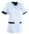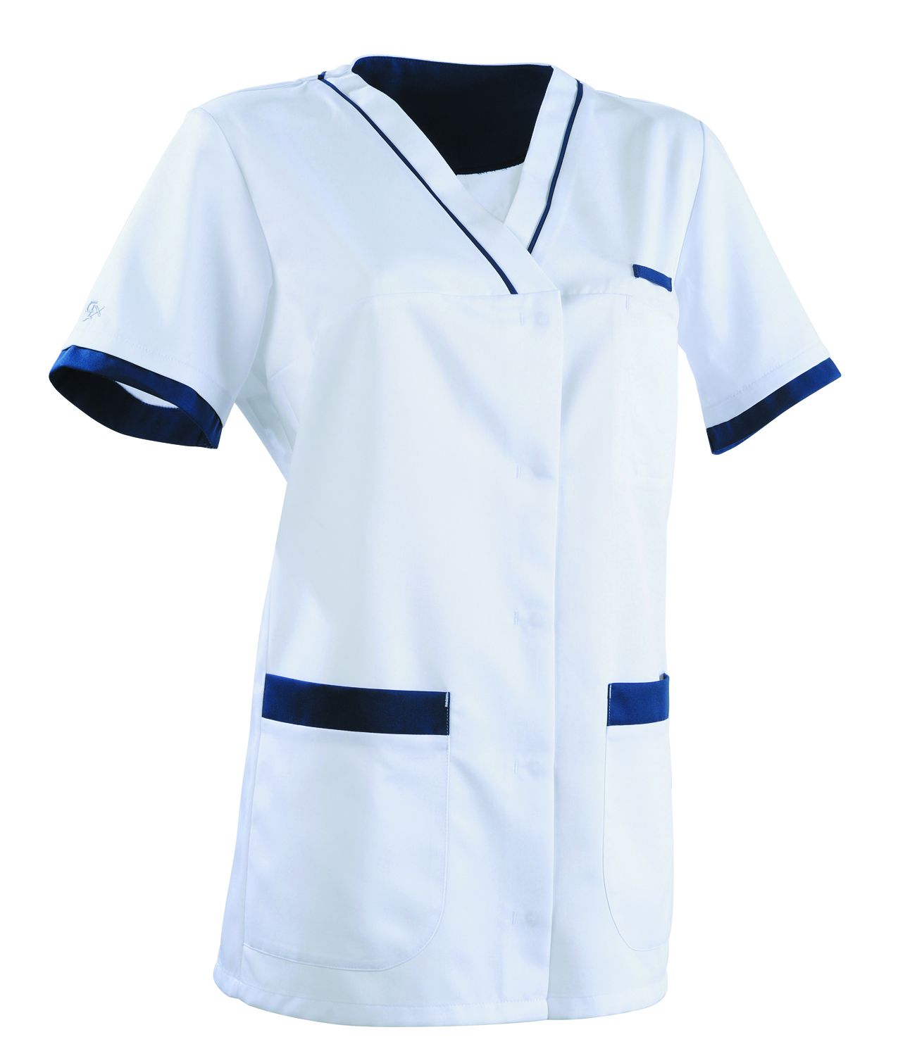 Bata Medica para Mujer ALEXANDRA Clemix 2.0 Lafont Blanco / Azul marino - Cuello con escote en V - Mangas cortas - Tejido: Sergé 50%, polyester 50%, algodón 180 g - Longitud espalda : 75 cm - Talla : 0 a 6