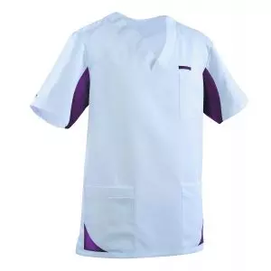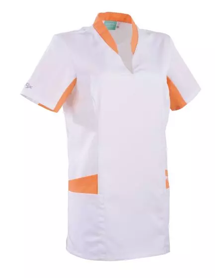 Bata Medica para Mujer LAURA 2LAU Clemix 2.0 Lafont blanca / naranja - talla ajustada - Escote cuello en V - Estilo polo Túnica - Longitud espalda : 75 cm - Talla : 0 à 6 - Color : Blanca