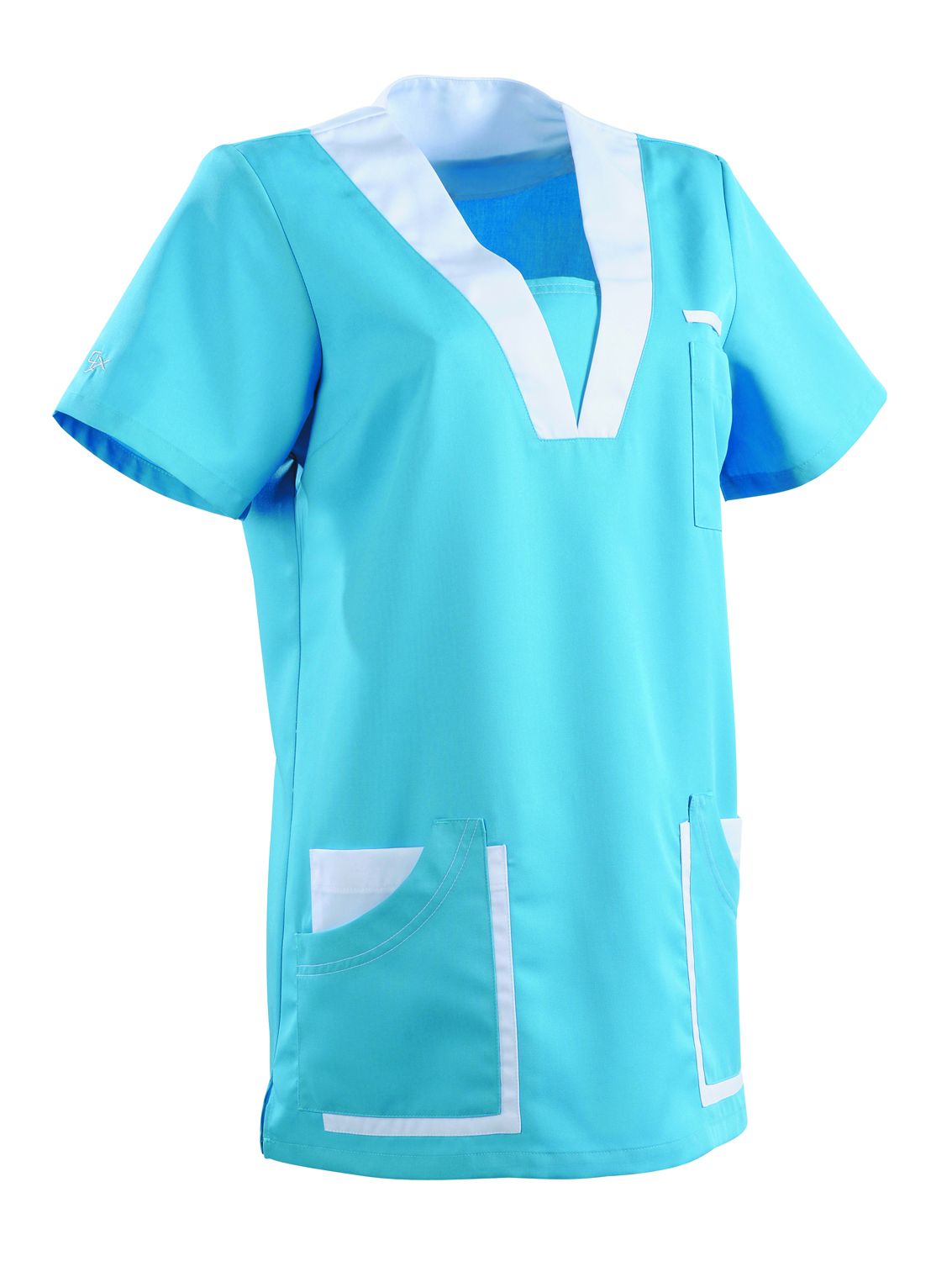 Bata Medica para Mujer MARIE Clemix 2.0 Lafont Azul Turquesa / Blanco - Cuello con escote en V - Mangas cortas - Longitud espalda : 75 cm - bata medica para enfermera - talla disponibles : de 0 a 6