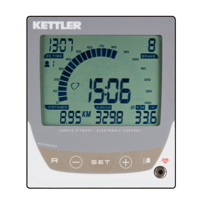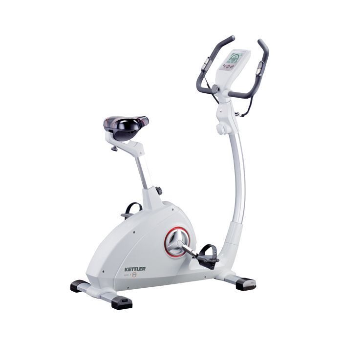 Bicicleta estática Golf M Kettler - Memoria de datos de 2 usuarios - Integrado receptor de la frecuencia cardíaca - Sistema de frenado magnético con regulación manual - Volante: 7 kg - Peso máximo permitido: 150 kg - Peso: 35 kg