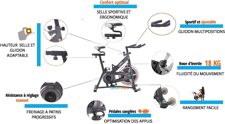 La bicicleta estática Indoor-cycling Z11-D es un aparato de nueva generación, equipada de un volante de inercia de 18,5 kg que le permitirá un entrenamiento de resistencia variado. Distinta a las bicicletas tradicionales de interior, el manubrio fijo, los pedales y todas las partes que la integran, están hechos con materiales de alta calidad. Es el equipo ideal para realizar entrenamientos profesionales en el interior de su casa o departamento. Su principal función son los entrenamientos de resistencia pero también ayuda a realizar ejercicios cardiovasculares. Para los ciclistas, una sesión con la bicicleta DKN puede ser una alternativa para sus entrenamientos en los días lluviosos o de mal tiempo. Hecha para uso regular, se adapta a todos los perfiles deportivos y se adapta a todas las alturas.El peso máximo soportado es de 120 kg. Su estructura esta hecha completamente en acero, lo cual le garantiza gran estabilidad y resistencia a la hora de realizar su ejercicios. Viene con un porta botellas para que no se detenga a buscar su botella de agua durante sus sesiones. Su asiento es muy cómodo y ha sido creado para ser lo mas ergonómico posible y se ajusta a diferentes tamaños. Cuenta con cintas ajustables en los pedales para evitar cualquier resbalo o derrape y con ruedas con las que podrá desplazar fácilmente su aparato.
