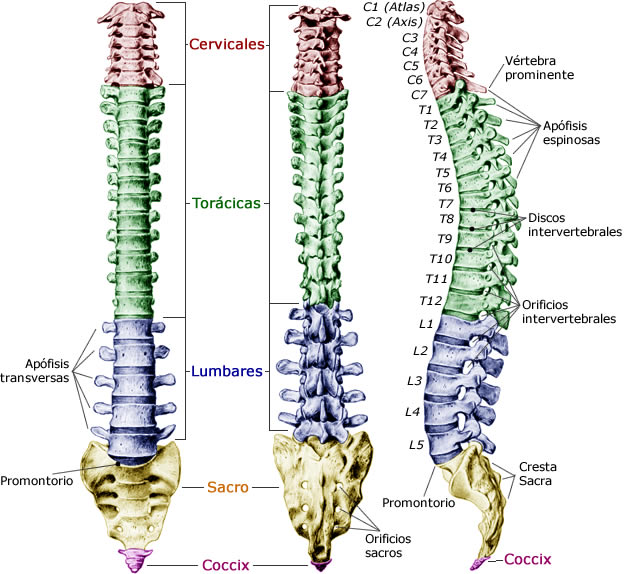 La columna vertebral se encuentra compuesta por 4 regiones, cervical, dorsal, lumbar, sacro-coxial y coxis, este conjunto óseo es el eje central de la anatomía humana.