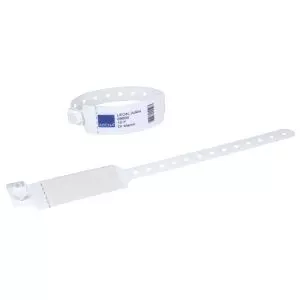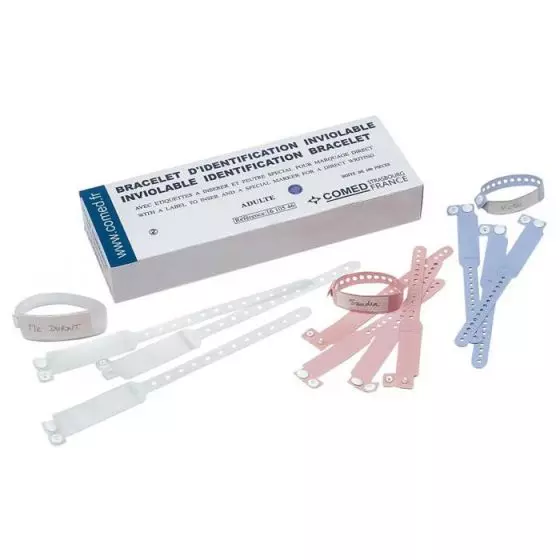 Pulsera de identificación Comed - Sistema de cierre inviolable - Mono utilización - Adulto y niño - Caja de 100 piezas - Incluida con etiqueta y rotulador espécial