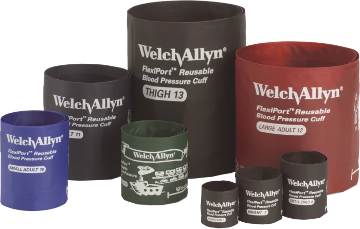 Los brazaletes FlexiPort reutilizables son accesorios utilizados para medir la presión arterial de un paciente con los monitores de pacientes Welch Allyn CSM 7100, Spot 4400, BP3400 y BP2000. Tienen la ventaja de ser sin látex y cuentan con un borde curvado para evitar molestias o riesgos de cortaduras.