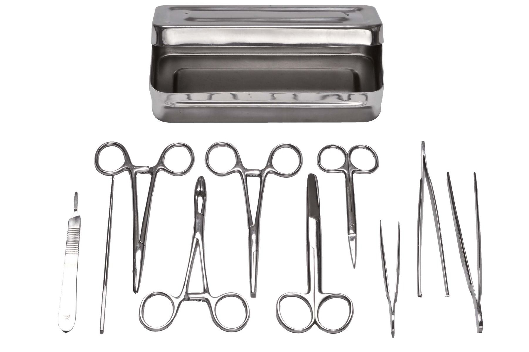 Fabricada en aluminio ligero y duradero, esta caja es robusta y fácil de transportar. El contenido de la caja incluye una selección de instrumentos de alta calidad, cuidadosamente elegidos por su funcionalidad y precisión. Entre los instrumentos incluidos se encuentran unas tijeras de iridectomía rectas de 11 cm, unas tijeras puntiagudas rectas de 14 cm, un mango de bisturí n.º 3, una pinza Kocher recta de 14 cm, una pinza Péan Murphy de 14 cm, una pinza de disección A/G de 14 cm, una pinza de disección S/G de 12,5 cm, una pinza para astillas de 10,5 cm, un portaagujas Mayo-Hégar de 14 cm y un estilete portaalgodón de 14 cm.