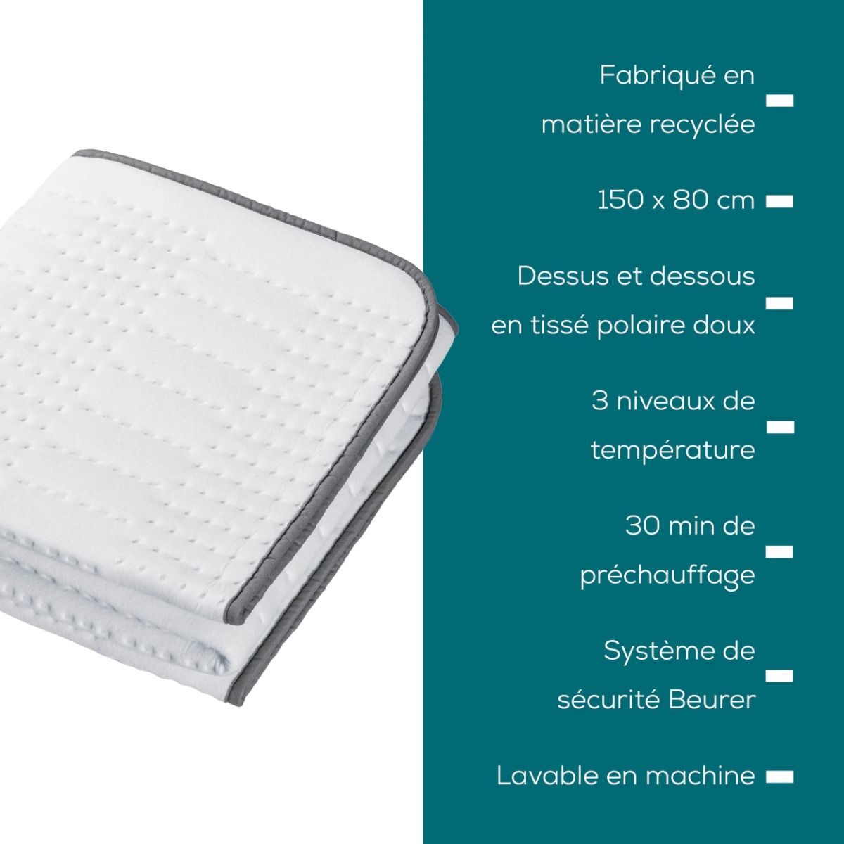 La práctica Beurer TS24 dispone de un interruptor extraíble y se puede lavar a máquina a 30 °C para facilitar su cuidado. Con un tiempo de calentamiento rápido de 30 minutos y el Sistema de Seguridad de Beurer (BSS), disfrute de una noche de sueño reparador con total tranquilidad.