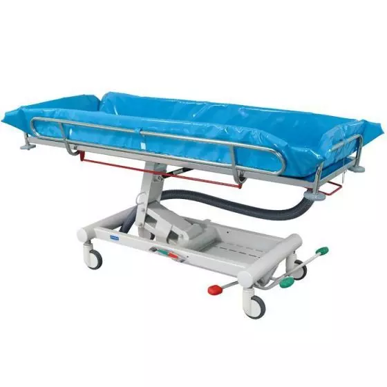 - La camilla de ducha de Ocea Promotal es fácil de utilizar durante el transporte hacia el baño y durante la ducha del paciente. Sus controles laterales son accesibles desde los dos costados de la camilla con el fin de que usted pueda configurar la altura y los frenos del aparato.
