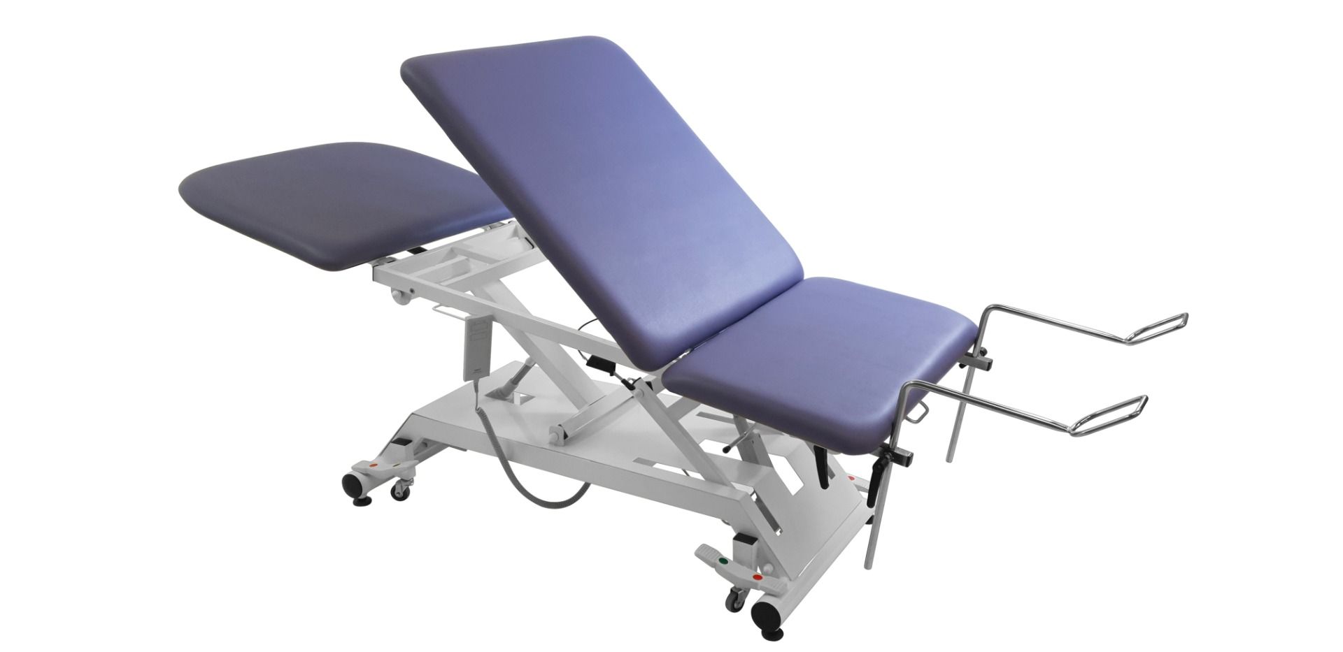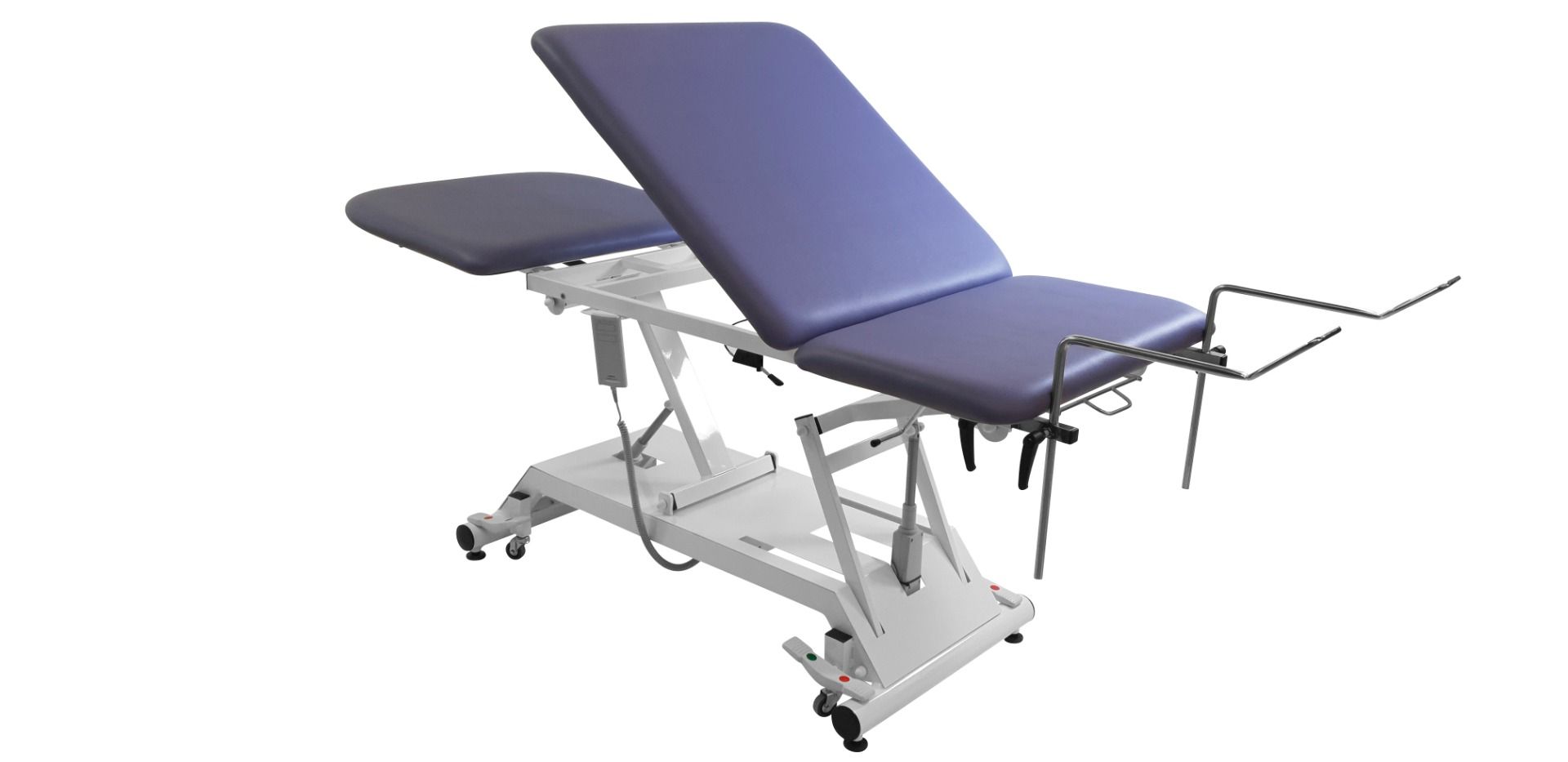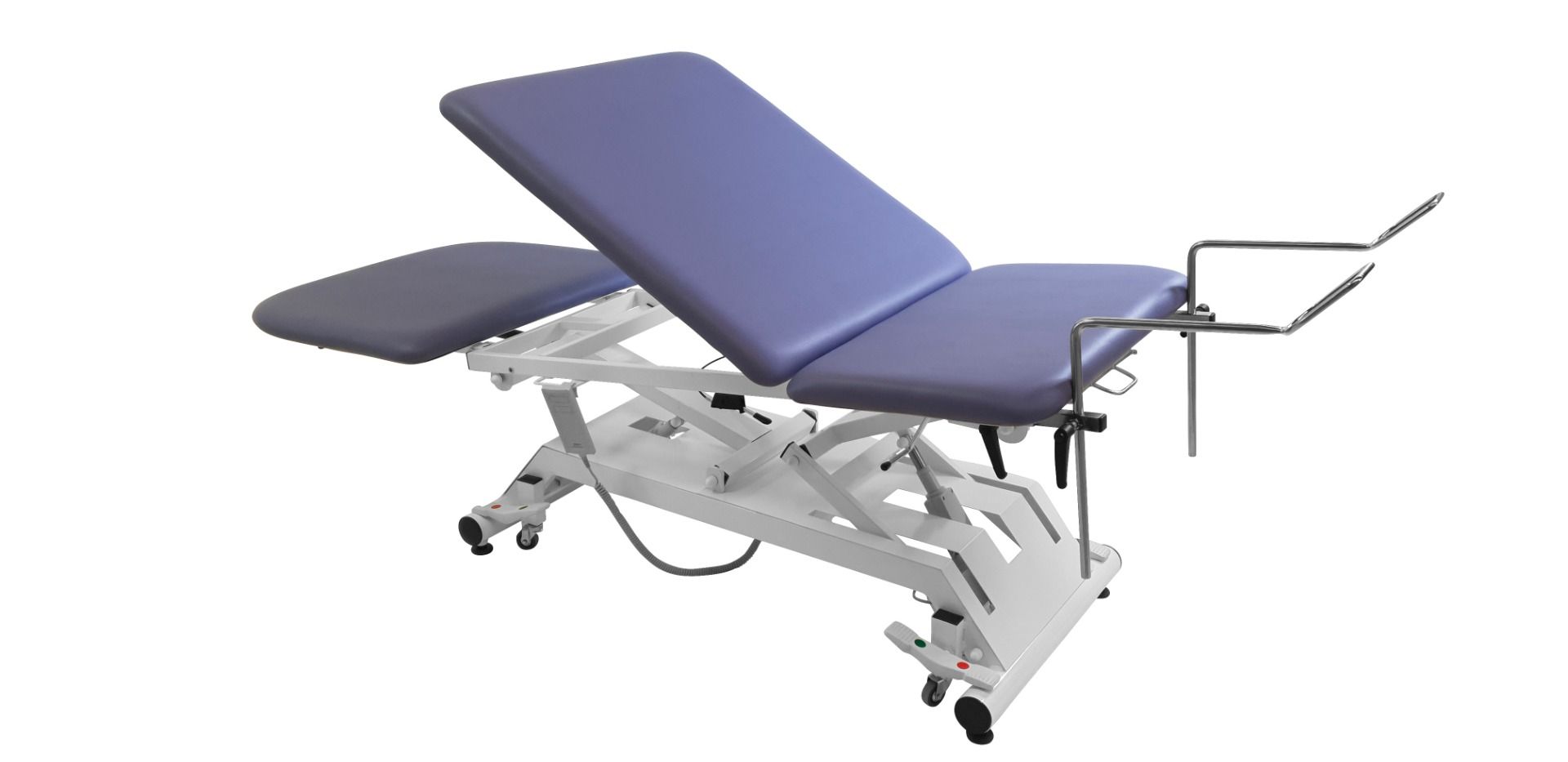 La cama de examen eléctrica de 3 planos Vimeu está equipada con un cuenco de acero inoxidable y enchufes deslizantes para estribos. También cuenta con un portarrollos en el respaldo y en la parte central para un acceso fácil a las sábanas de examen.