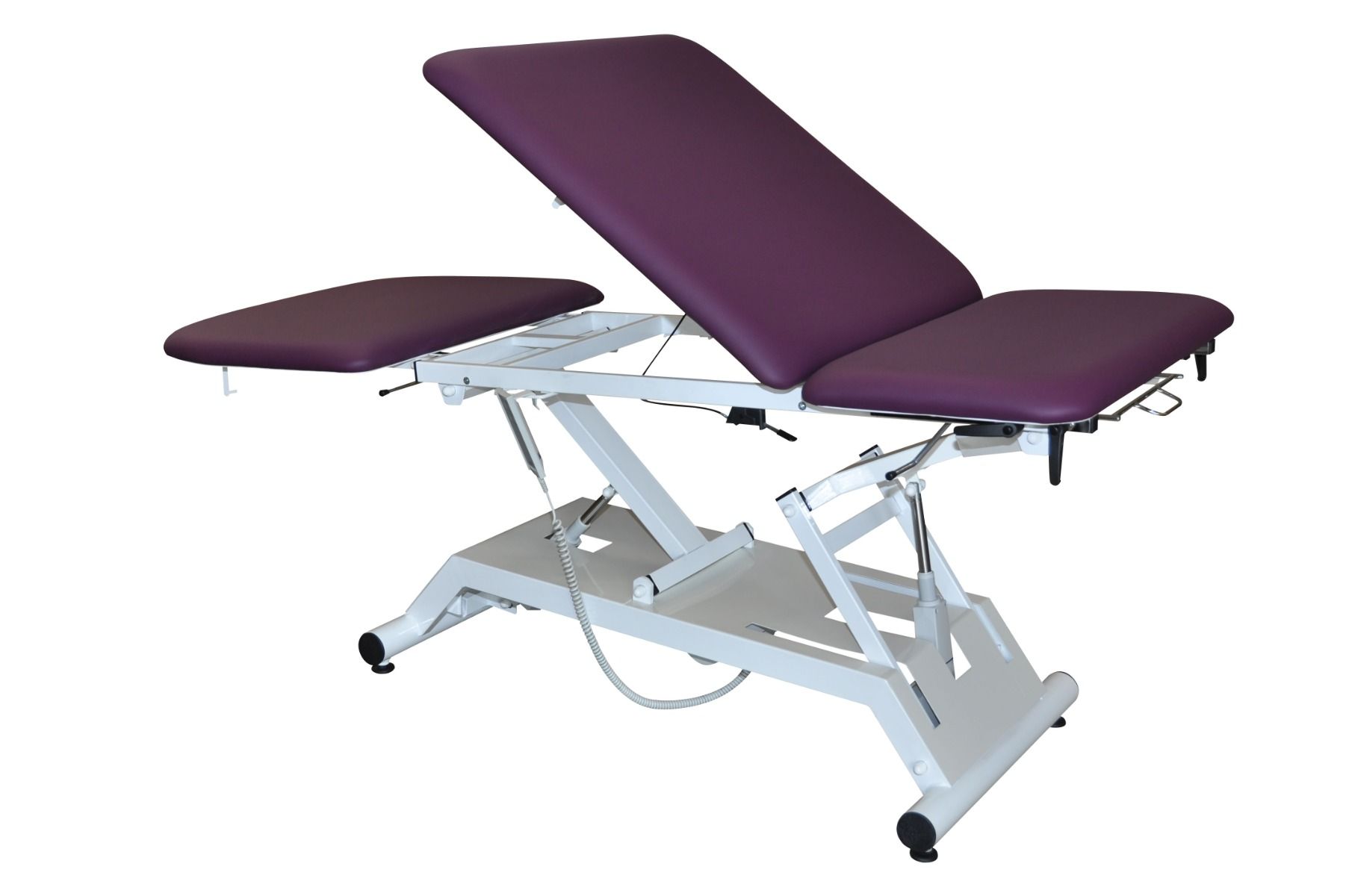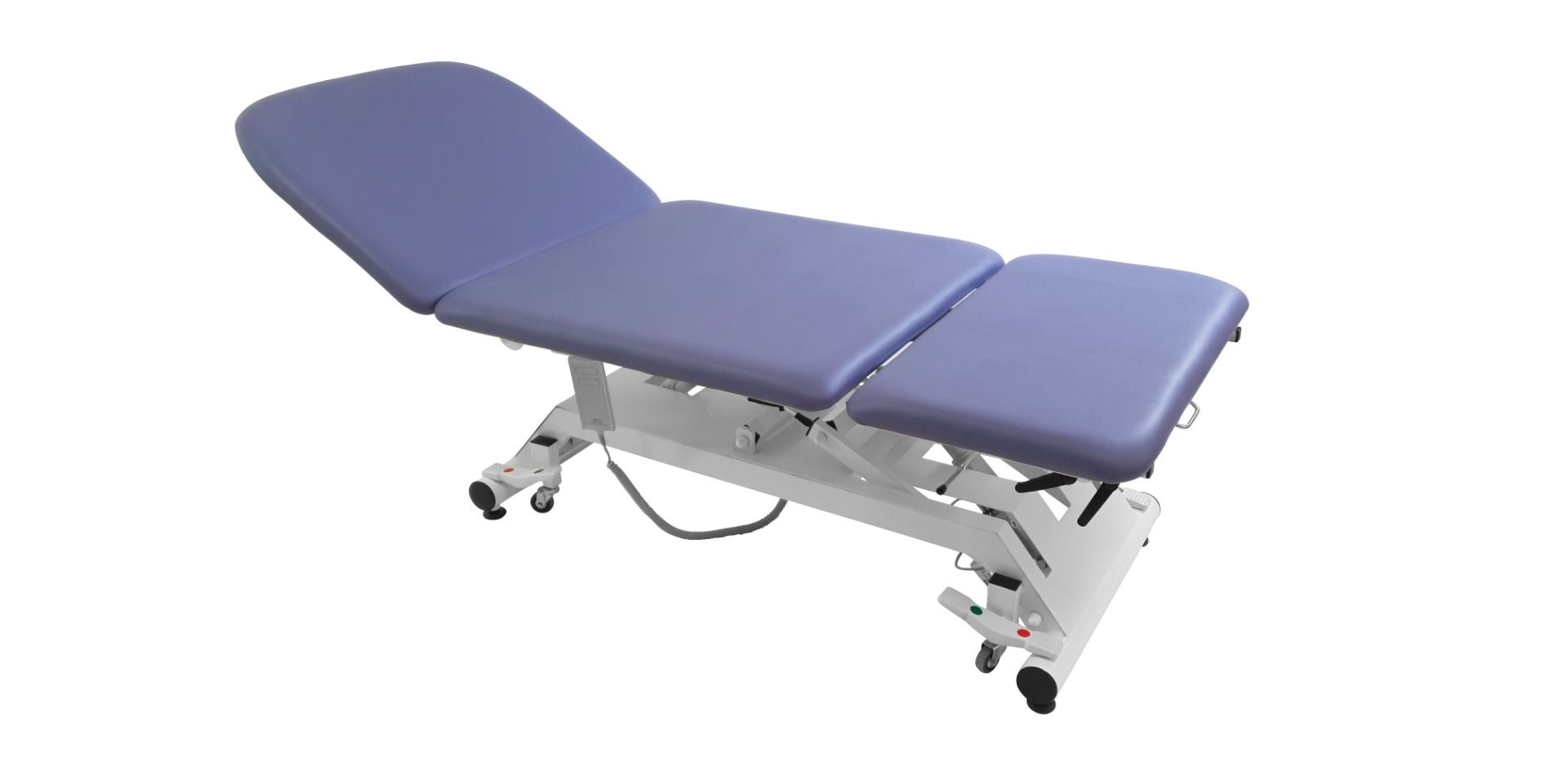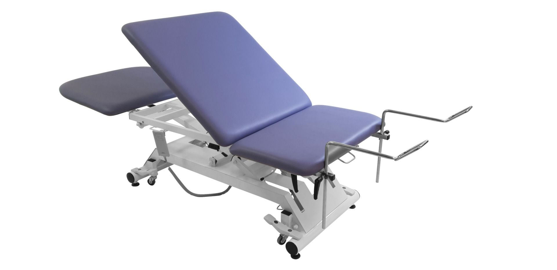La cama de examen eléctrica de 3 planos Vimeu está equipada con un cuenco de acero inoxidable y enchufes deslizantes para estribos. También cuenta con un portarrollos en el respaldo y en la parte central para un acceso fácil a las sábanas de examen.