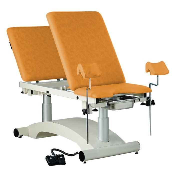 Camilla de examen eléctrica de altura variable de 3 secciones con un par de estribos Carina Ovalia 13 - Respaldo ginecológico - Pedal compacto 3 funciones con conmutador electrónico - Garantía 2 años