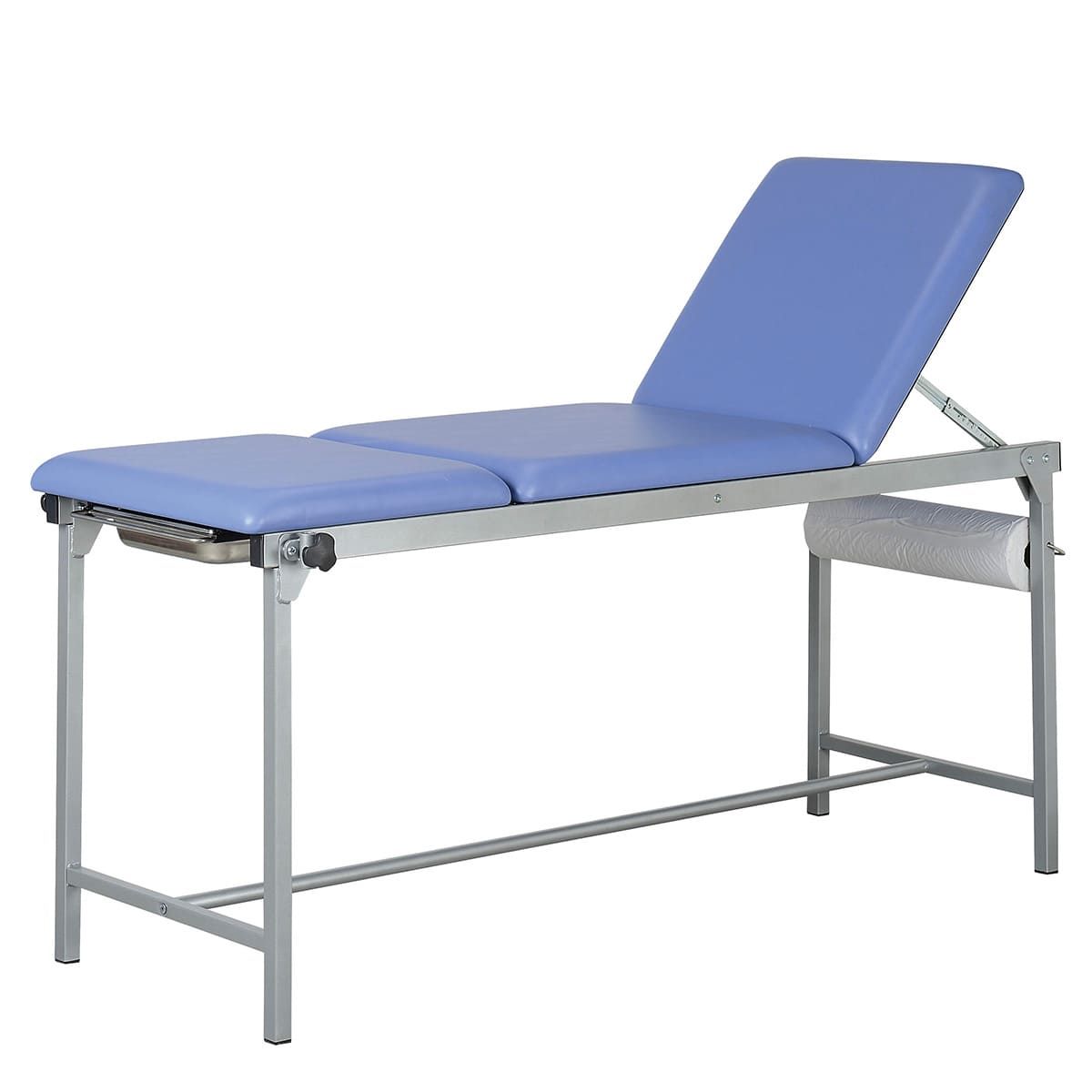 El respaldo de esta camilla es ajustable gracias a dos cremalleras indexables, lo que proporciona una gran flexibilidad durante los exámenes médicos. Además, está equipado con un portarrollos para sábanas de examen para una mayor comodidad.