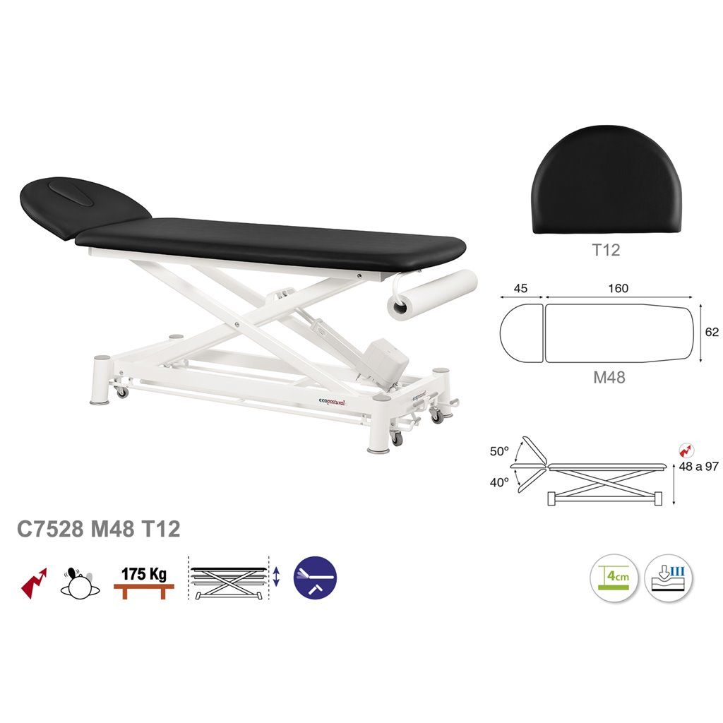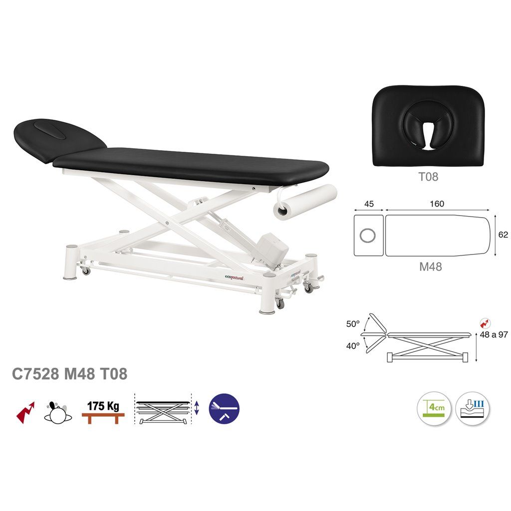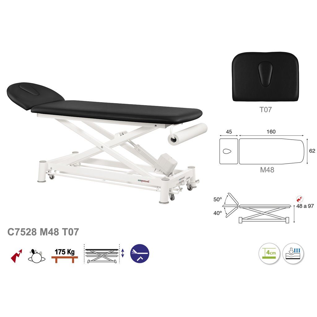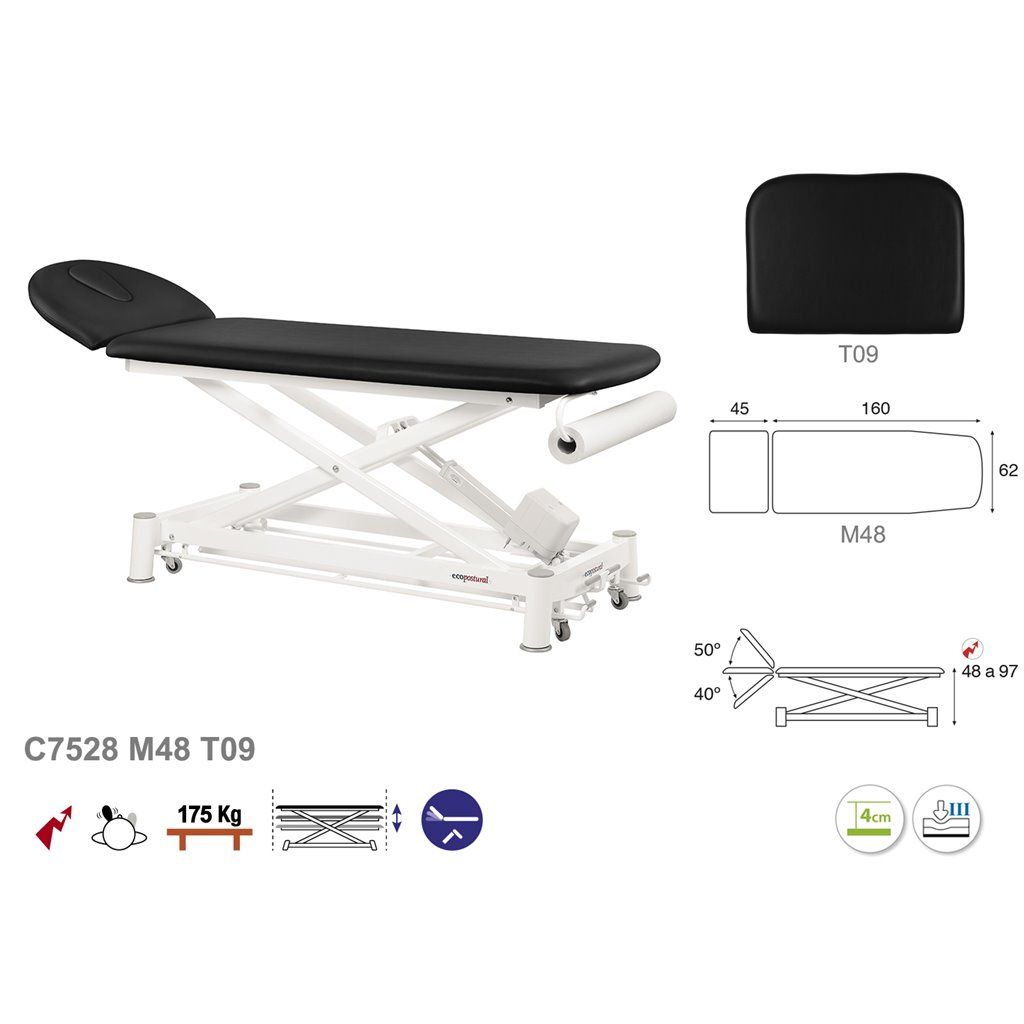 Camilla de masaje eléctrica 2 cuerpos con sistema periférico Ecopostural C7528 - Regulación de altura mediante motor eléctrico con sistema periférico - Portarrollos incorporado de serie - Altura regulable: 48 - 97 cm - Dimensión estándar : 62 x 207 cm - Garantía 3 años