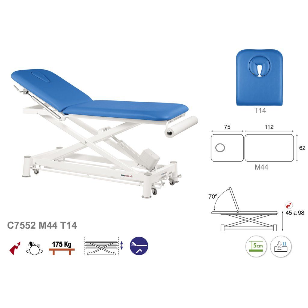 Camilla de masaje eléctrica 2 cuerpos con sistema periférico Ecopostural C7552 - Regulación de altura mediante motor eléctrico con sistema periférico- Portarrollos incorporado de serie - Altura regulable: 45 - 98 cm - Dimension estandar : 62 x 188 cm - -Medidas Opcionales C-7552-M64 (70 x 188 cm.)