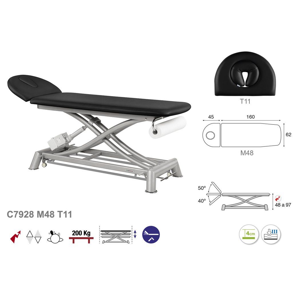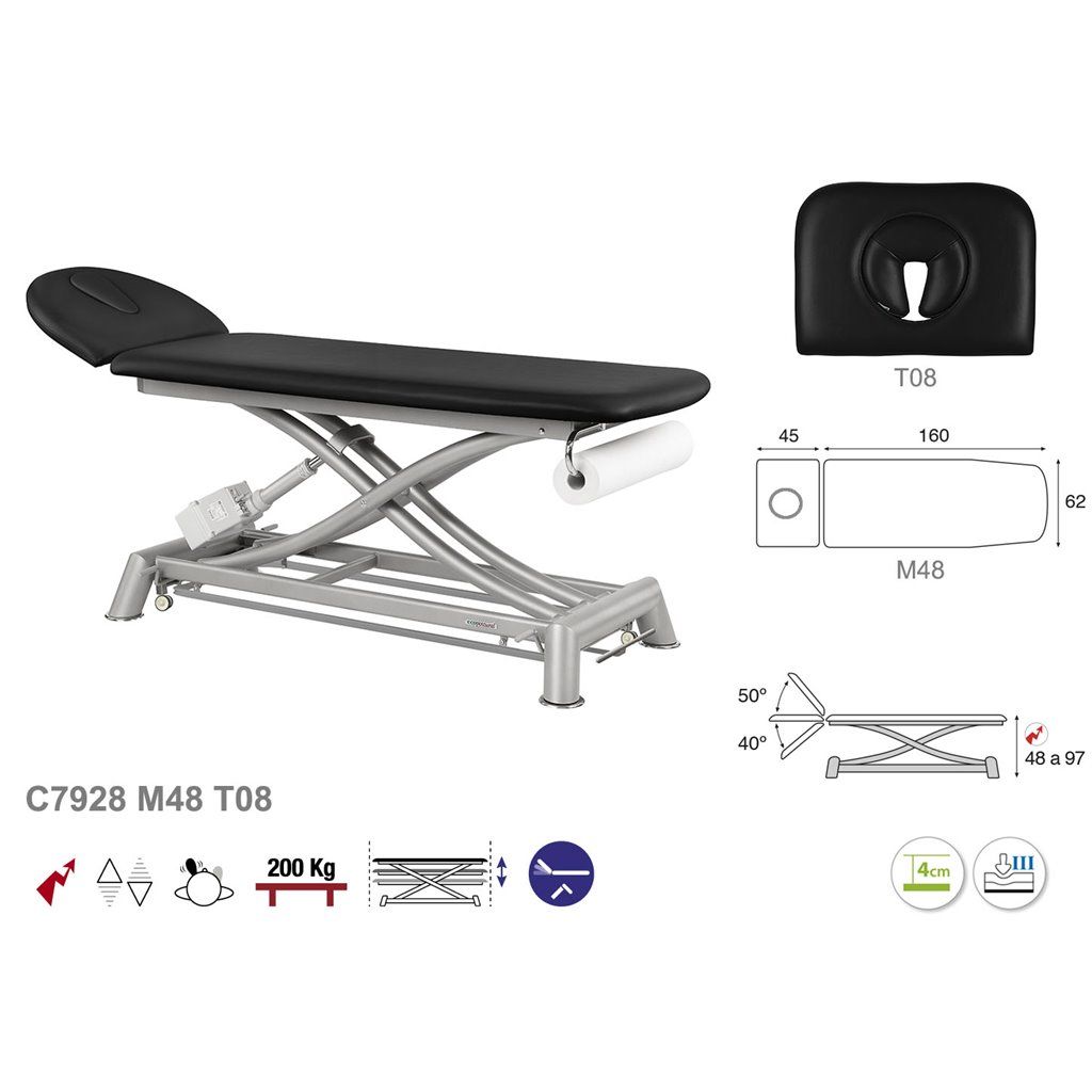 El modelo C7926 es una camilla de masaje electrica de 3 cuerpos con 3 secciones de 62 cm de ancho por 198 cm de largo y altura regulable de 48 cm hasta 97 cm.