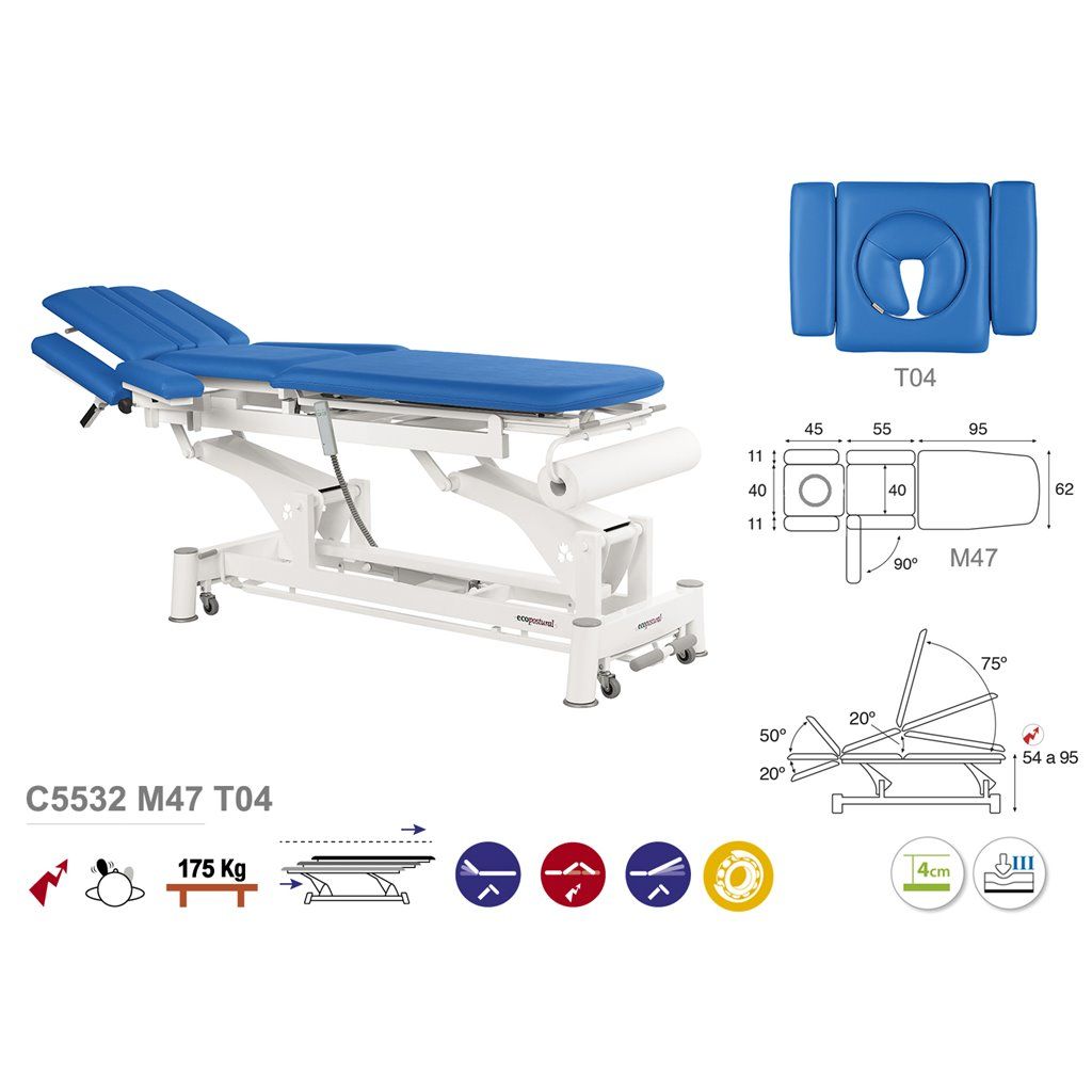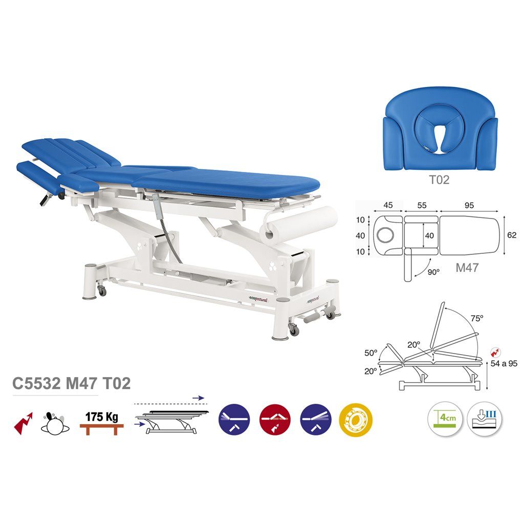La Camilla de masaje eléctrica Ecopostural C5532 es una camilla de masaje de 3 cuerpos con 9 secciones.