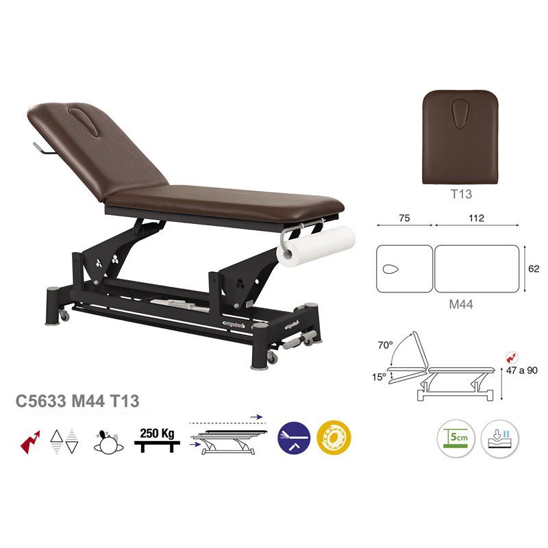 C camilla de masaje eléctrica Ecopostural C5633 de 2 secciones camilla de masaje barra envolvente y estructura negra Dimensiones tapizado estándar: 62x188 cm (M44) Dimensiones tapizado opcional: 70x188 cm (M64) Carga máxima recomendada: 250 Kg Regulación de altura: 47-90 cm Sistema de regulación de altura motorizado envolvente.