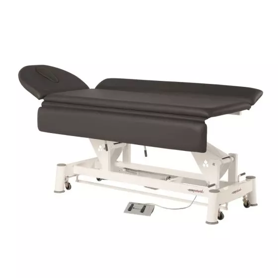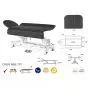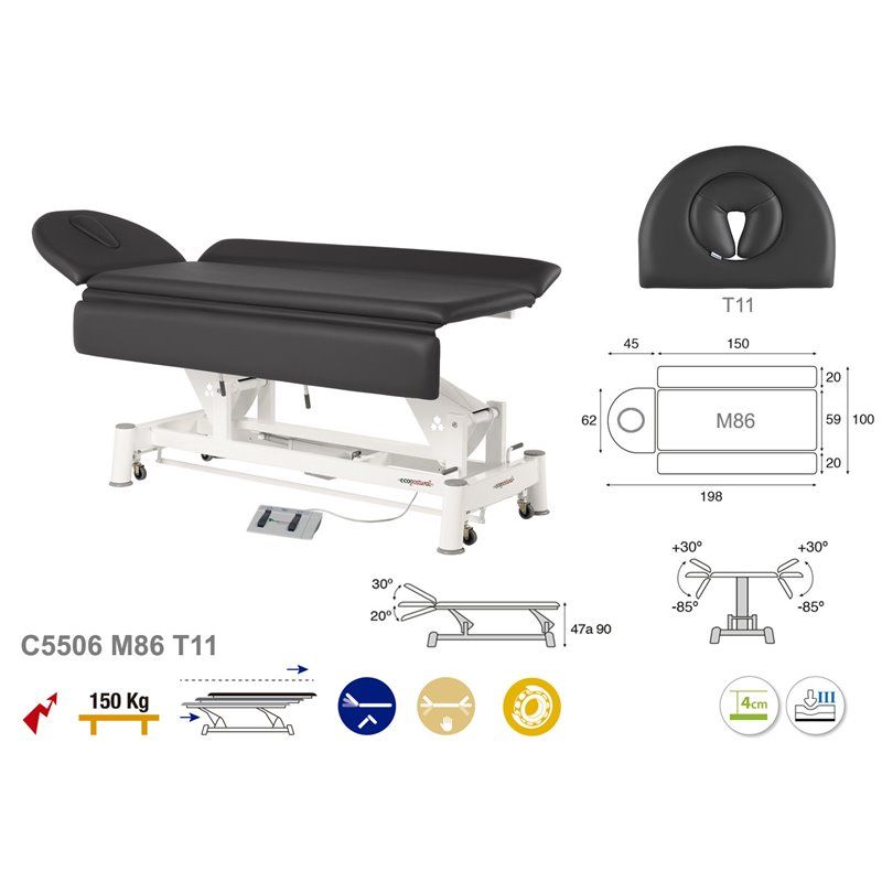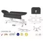 La camilla de masaje eléctrica C5506 puede ser ampliada ya que esta posee dos planos laterales modulables de 20 cm de largo cada uno que permite alargar el ancho de la camilla de masaje de 60 cm hasta 100 cm. Su altura es configurable gracias al control eléctrico que se encuentra a la altura de los pies. Su estructura está hecha en acero y las patas de la camilla en polipropileno de alta resistencia lo cual hace que la camilla se mantenga estable. La camilla de masaje C5506 dispone de ruedas plegables para facilitarle el desplazamiento de la camilla de un lugar a otro. Además, la camilla posee un espaldar inclinable a 70° y una cabecera que dispone de un agujero para el rostro con una tapa incluida.