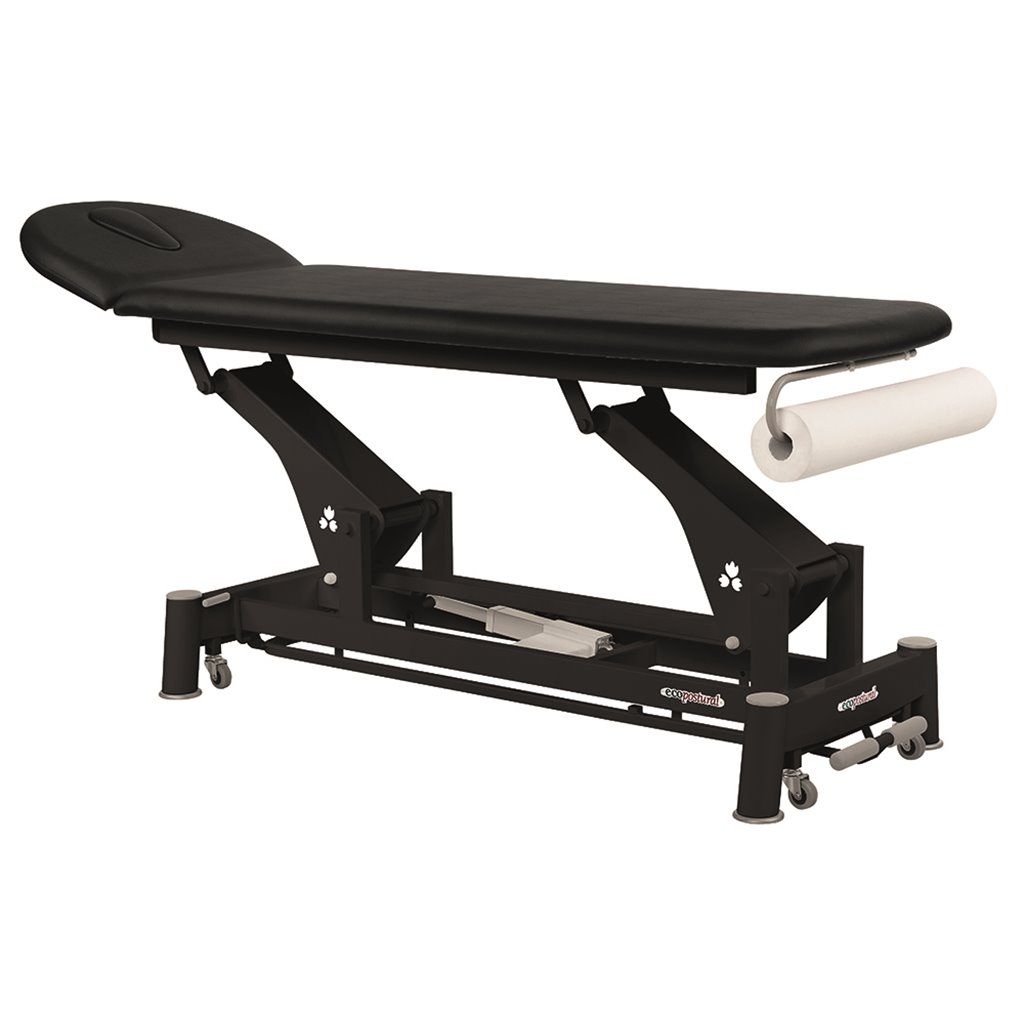 Con dos tornillos niveladores de suelo en el interior de las patas. Estructura fabricada en tubo de acero lacado con pintura epoxi negra horneada a 250°C. Ruedas escamoteables accionadas por pedal (sólo para movimiento en vacío, no para transporte de pacientes). Portarrollos abatible incluido de serie. Reposacabezas estándar tipo T10- Reposacabezas redondeado.