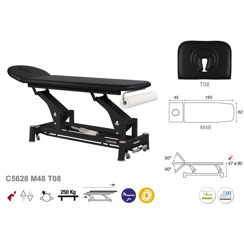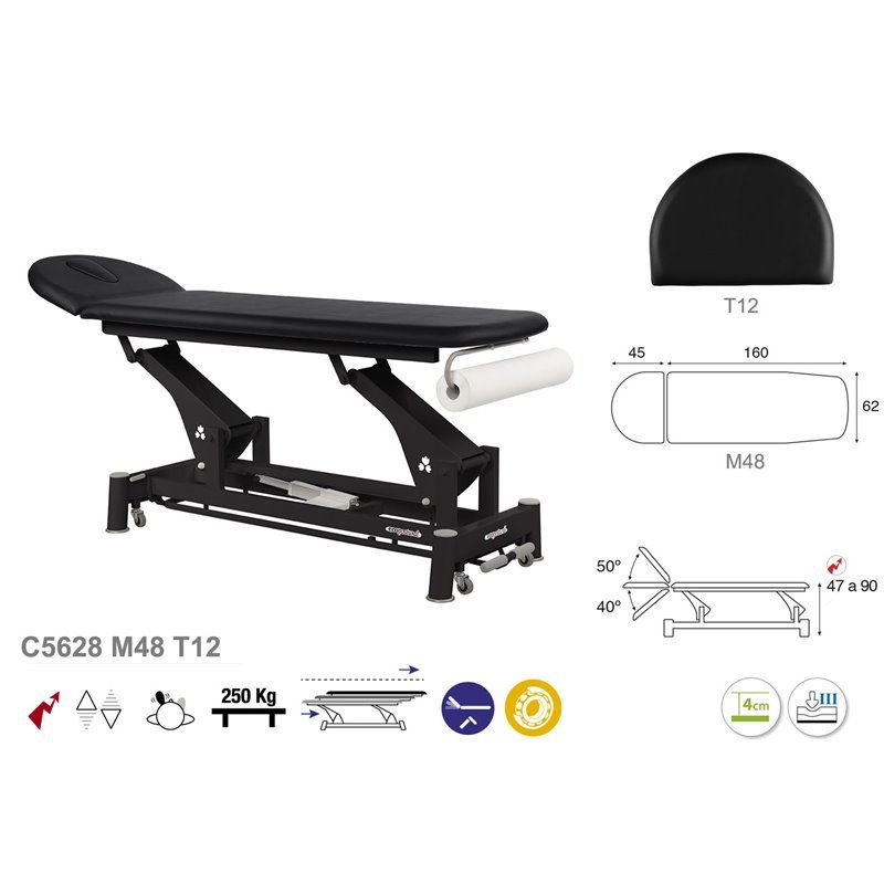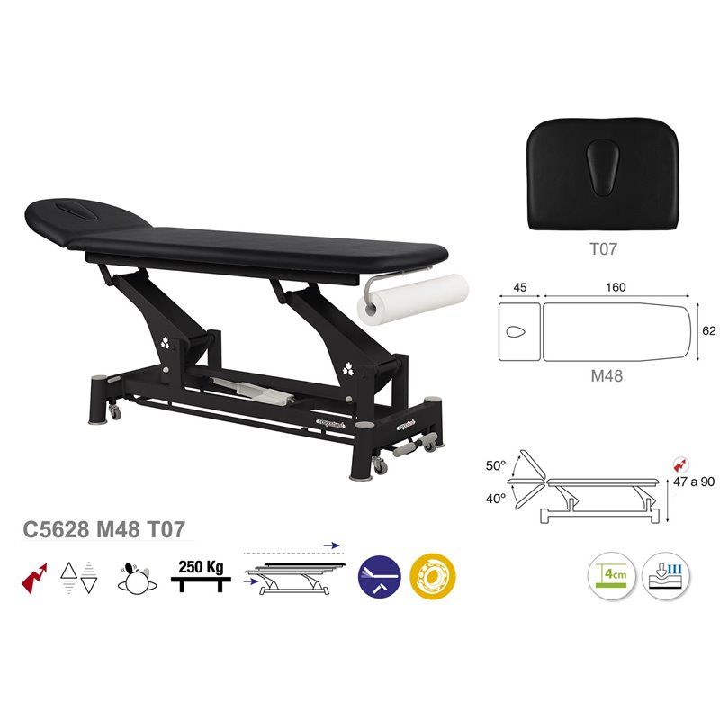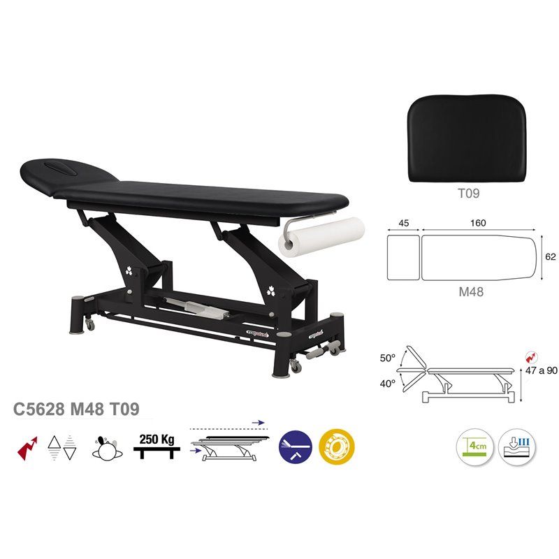 Camilla eléctrica varilla técnica negra Dimensiones tapizado estándar: 62x207 cm (M48) Carga máxima recomendada: 250 Kg Regulación de altura: 47-90 cm Sistema de regulación de altura mediante sistema periférico con motor. Elevación con desplazamiento lateral < 20cm Patas con diámetro de 70 mm Chasis con rodamientos.