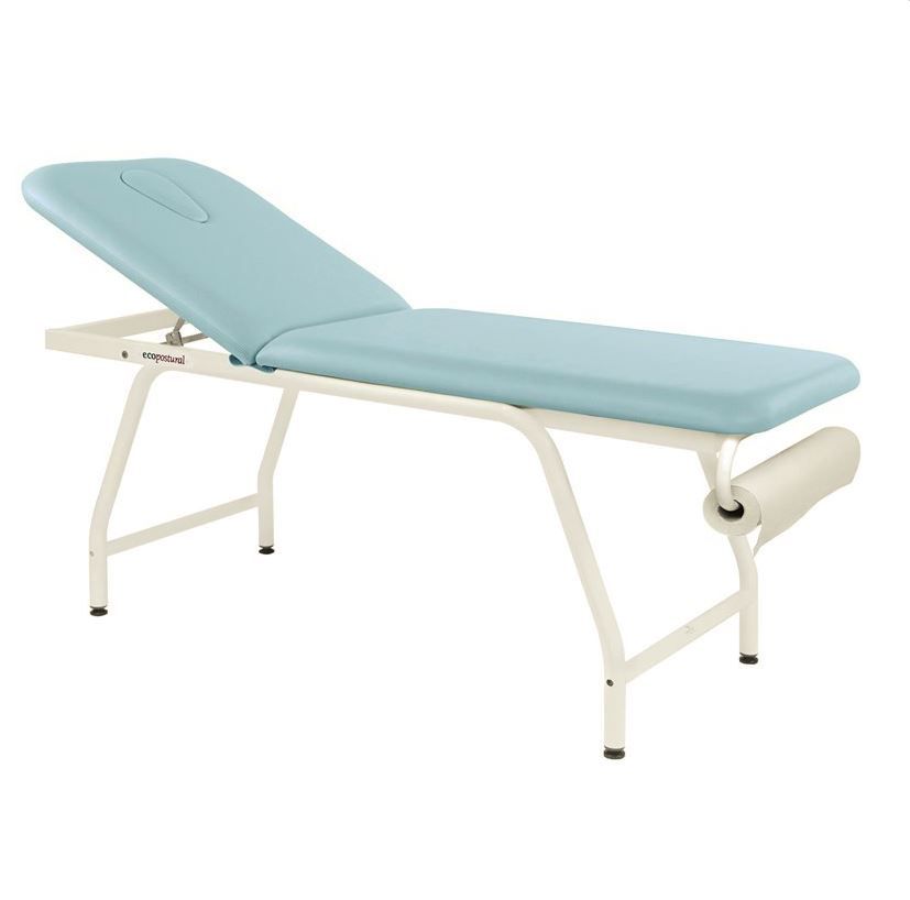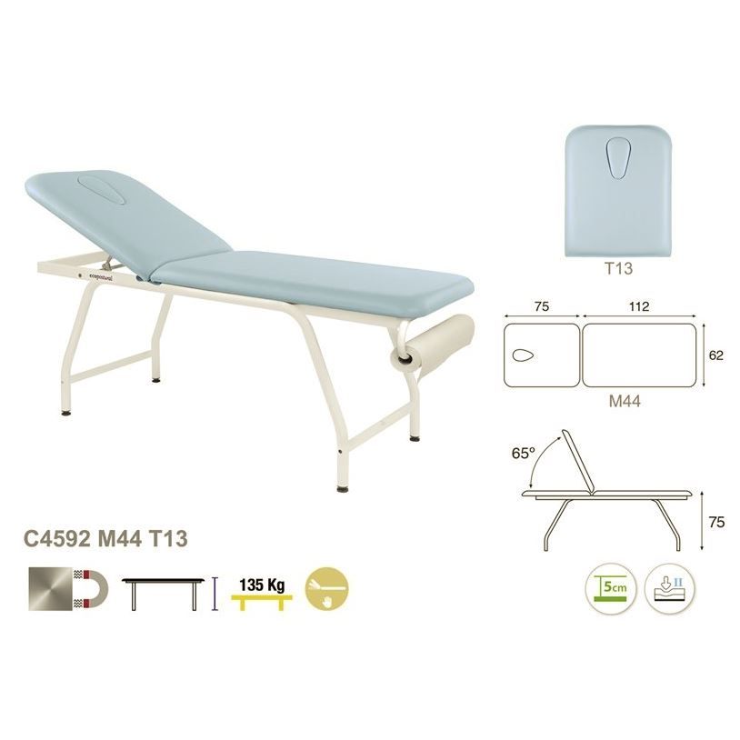La camilla de masaje fija de metal blanco Ecopostural C4592 2 niveles tiene una estructura de acero lacado con pintura epoxi blanca horneada a 250º y espuma de 5 cm de espesor con soporte equilibrado II para garantizar solidez y estabilidad durante el tratamiento. Sus dimensiones ofrecen comodidad al paciente, con una longitud de 188 cm y una anchura de 62 cm para el modelo clásico y 70 cm para el modelo opcional. El respaldo puede inclinarse hasta un máximo de 65°, lo que permite realizar los exámenes en las mejores condiciones.