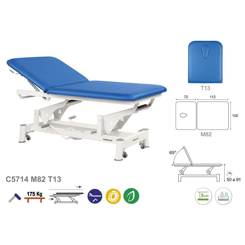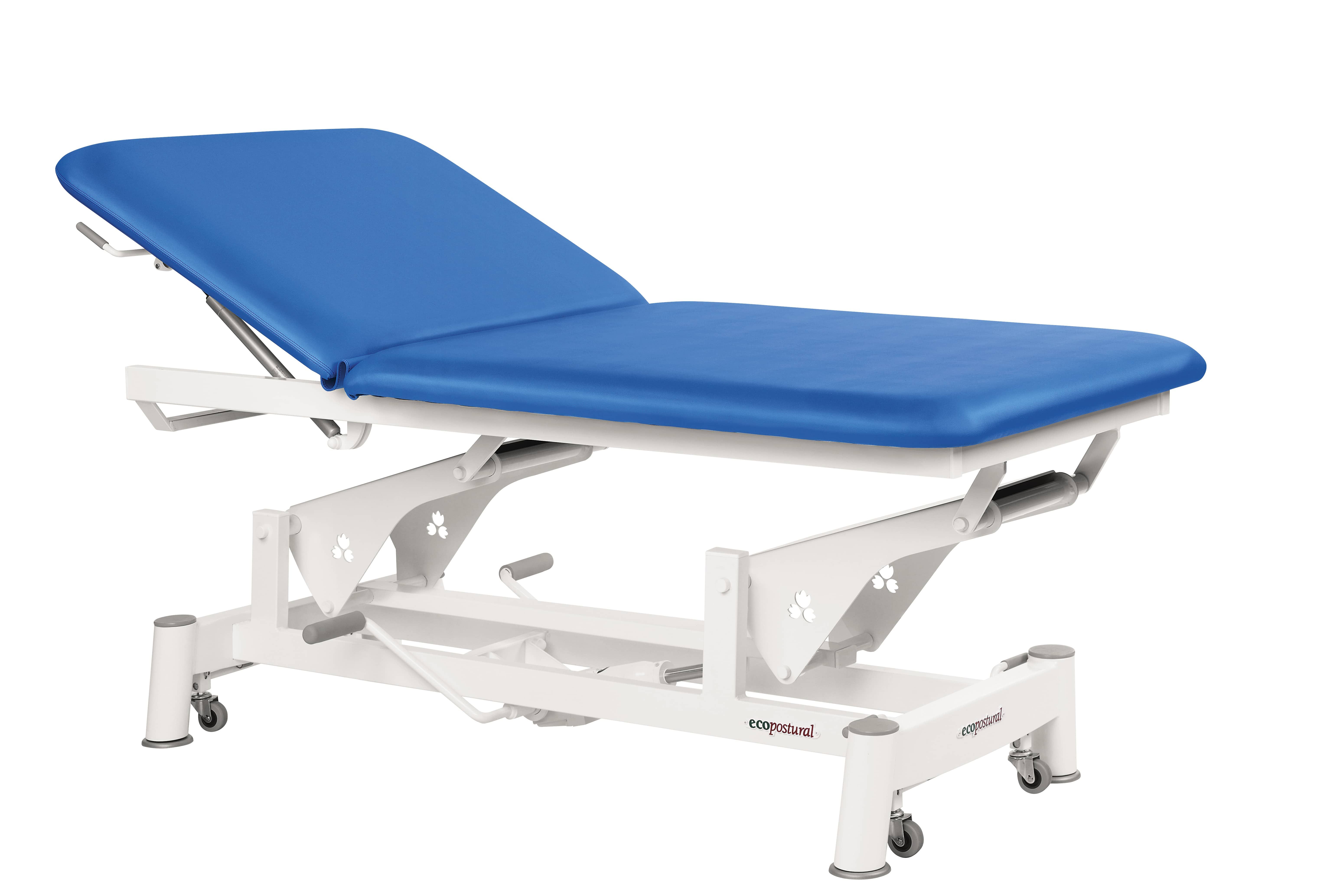 La Camilla de masaje hidráulica bobath 2 cuerpos Ecopostural C5714 dispone de un sistema de regulación de altura mediante sistema de bomba hidráulica accionada mediante pedal mecánico.