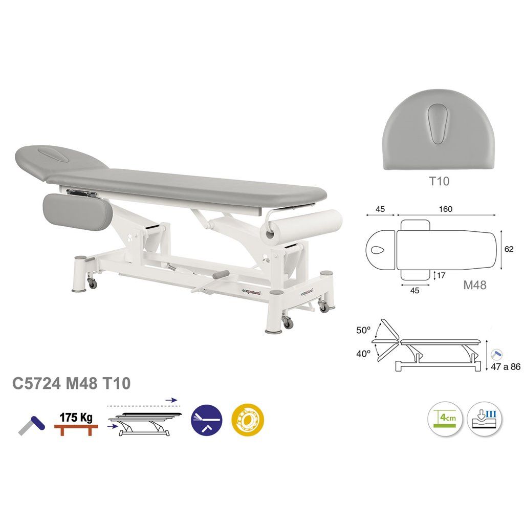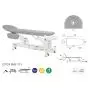 No son aptas para el transporte de pacientes - Sistema hidráulico de regulación de altura mediante pedal - Regulación del reposacabezas mediante resorte de gas - T10: Reposacabezas ergonómico con cavidad facial en forma de lágrima y tapón incluido - Juego de reposabrazos abatibles (fijos) - Portarrollos abatible incluido de serie - Tapicería estándar: espuma de poliuretano de 4 cm de espesor y soporte III-Firm - Capacidad de carga máxima: 175 Kg.