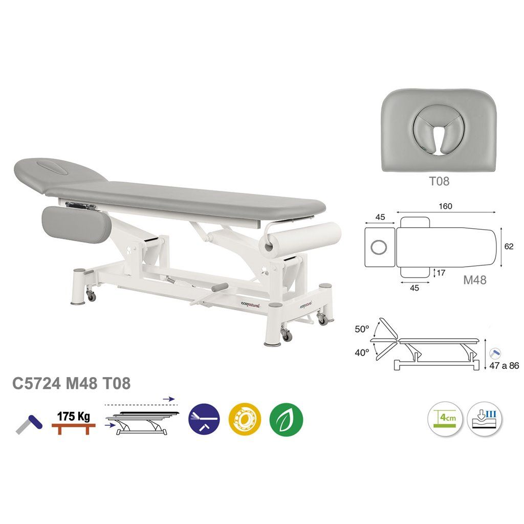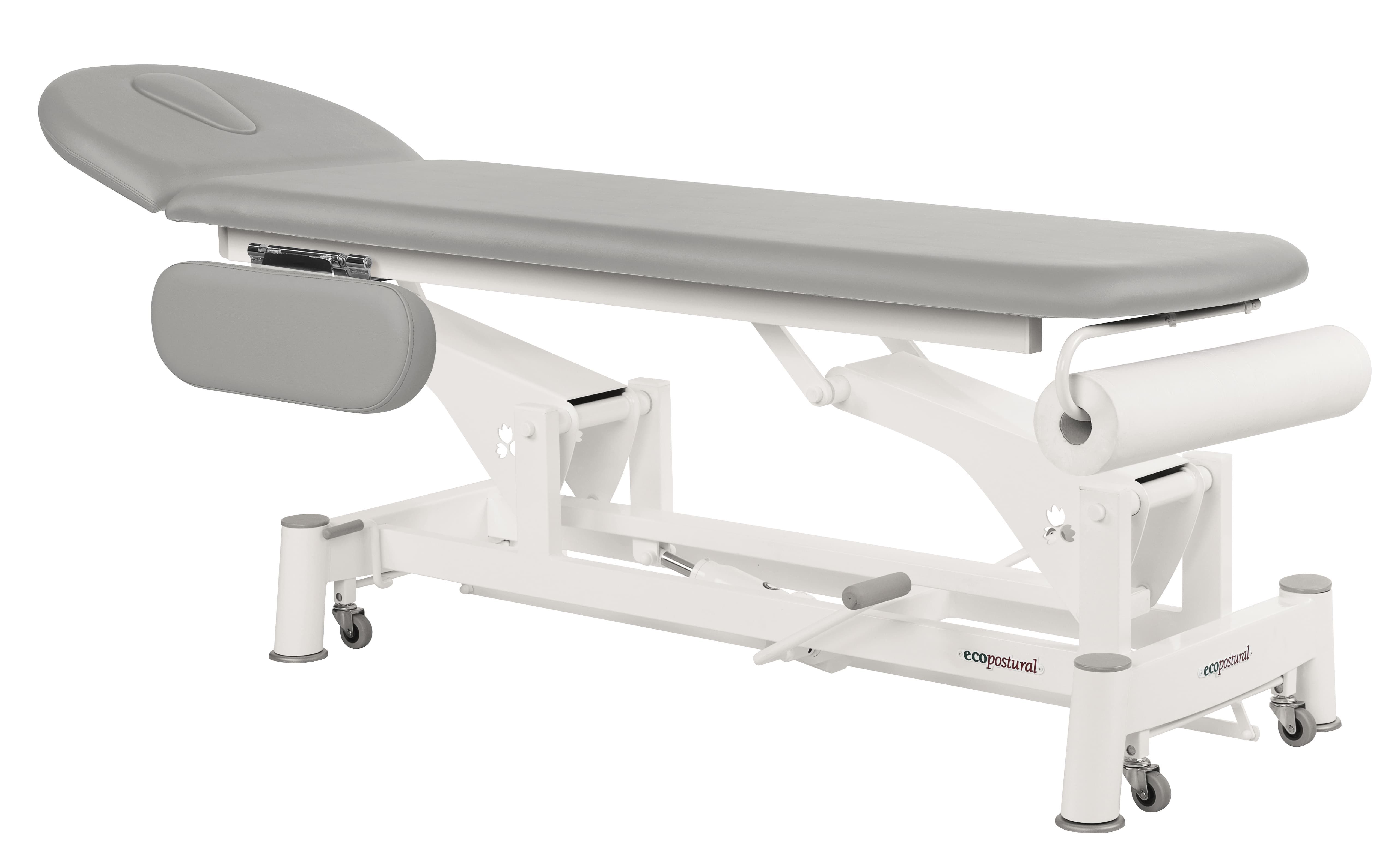 La camilla de masaje hidráulica con repos abrazos Ecopostural C5724 es un diván de 2 alturas con sistema hidráulico de regulación de altura mediante pedal. Su estructura es de tubo de acero lacado con pintura epoxi cocida en horno a 250º. Dispone de una pieza embellecedora frontal con pies redondeados de polipropileno de alta resistencia y una pieza embellecedora lateral.