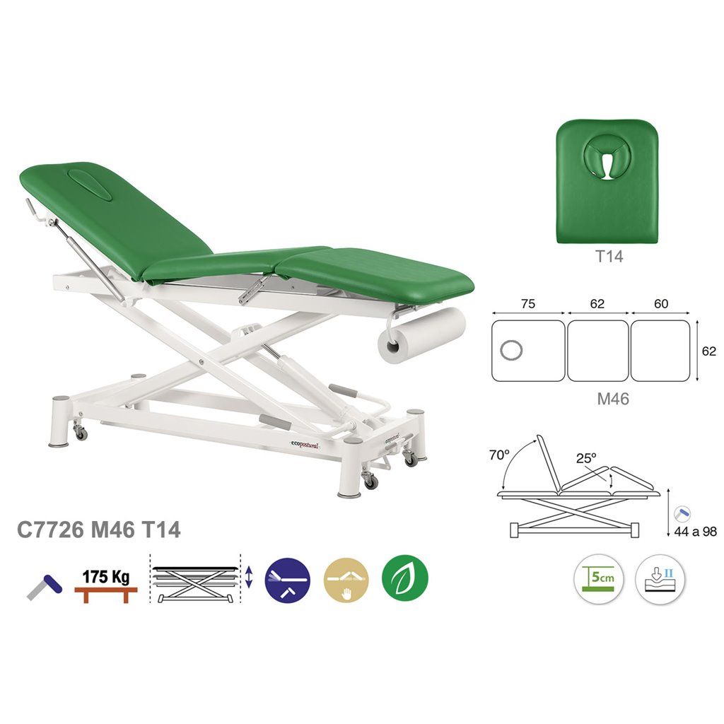 Camilla de masaje hidráulica de 3 cuerpos Ecopostural C7726 - Regulación de altura mediante sistema de bomba hidráulica accionada mediante pedal mecánico - Altura regulable: 48-93 cm - Dimensión estándar : 62 x 198 cm - Garantía 3 años - fabricado en España