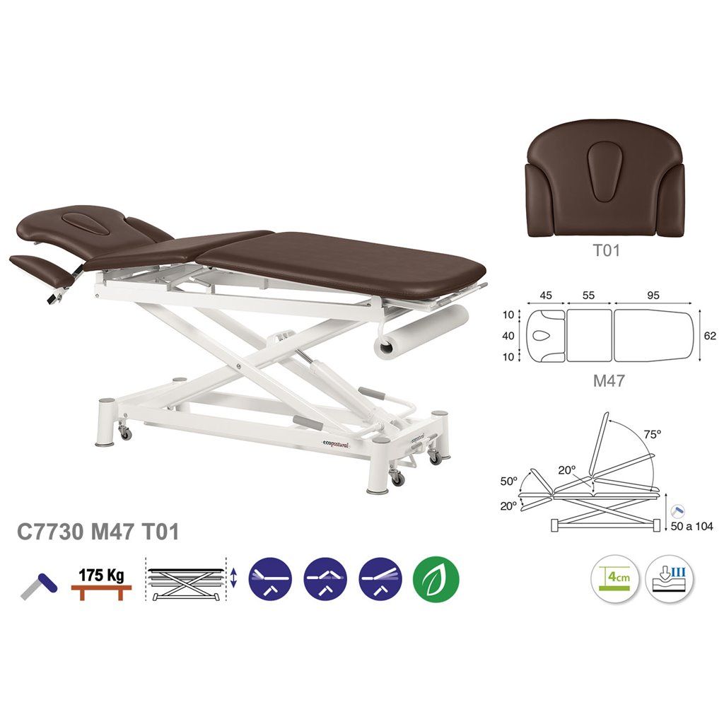 Camilla de masaje hidráulica multifuncional de 3 cuerpos Ecopostural C7730 - Regulación de altura mediante sistema de bomba hidráulica accionada mediante pedal mecánico - Altura regulable: 59-104 cm - Dimension estandar : 62 x 200 cm - Garantía 3 años - fabricado en España