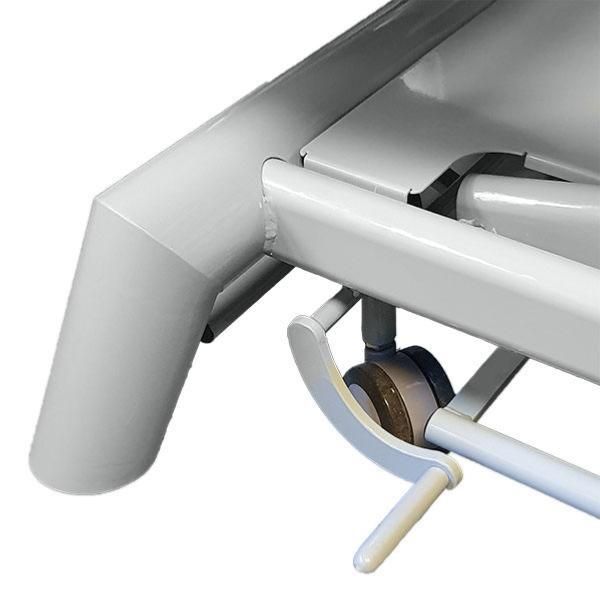 Movilidad y estabilidad: Para una mayor movilidad, la camilla de exploración de altura variable Sira 2 está equipada con cuatro ruedas retráctiles de gran diámetro (75 mm), multidireccionales y con control central, que facilitan el desplazamiento de la camilla cuando está vacía. Los patines estabilizadores ajustables de las cuatro patas garantizan una estabilidad perfecta en cualquier tipo de suelo, incluso los irregulares.
