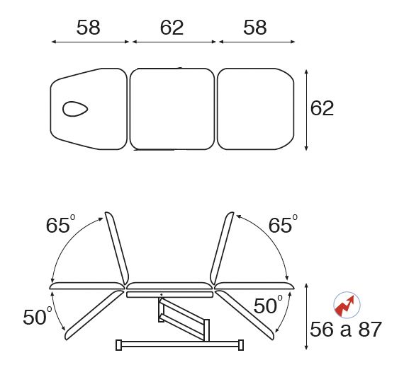 - Cuerpos reclinables: Parte del respaldo y parte de los pies mediante sistema de pomo / palanca