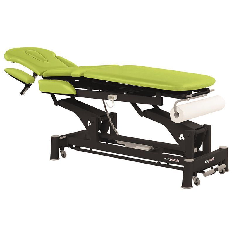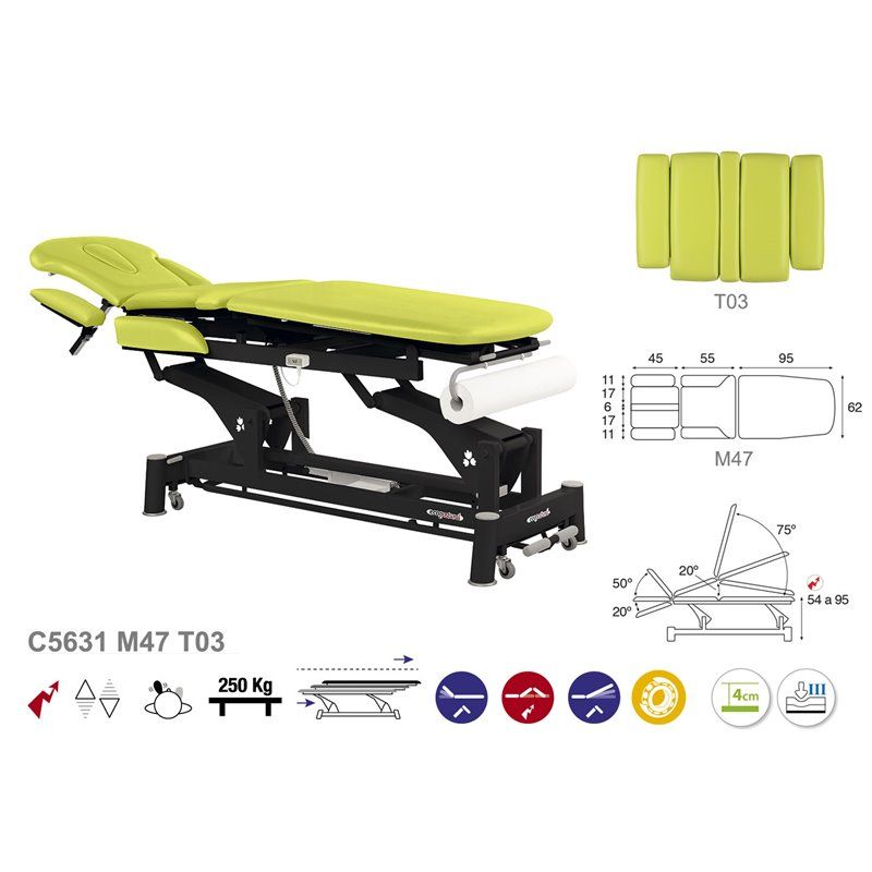 Camilla eléctrica de 2 planos con chasis negro Ecopostural C5631 Dimensiones tapizado estándar: 62x200 cm (M47) Carga máxima recomendada: 250 Kg Regulación de altura: 54-95 cm Sistema de regulación de altura con motor periférico.