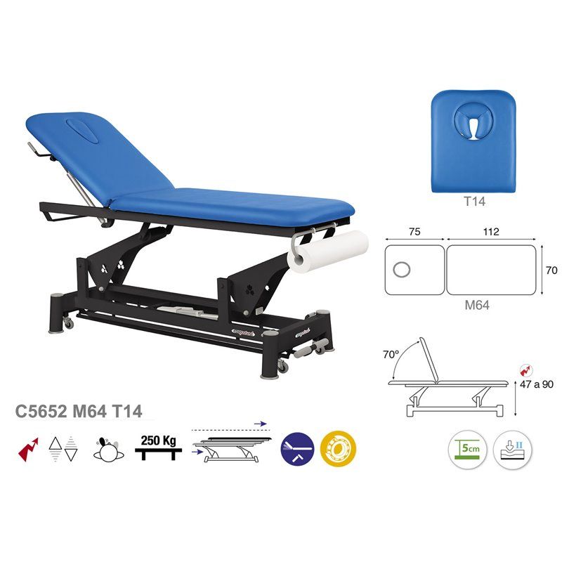 Camilla de masaje eléctrica Ecopostural varilla negra 2 niveles C5652 Dimensiones tapizado estándar: 62x188 cm (M44) Dimensiones tapizado opcional: 70x188 cm (M64) Carga máxima recomendada: 250 Kg Regulación de altura: 47-90 cm Sistema de regulación de altura periférica con motor.