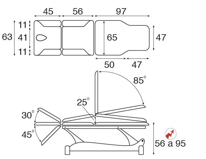 - Respaldo elevable 30º y abatible 45º, parte central elevable 25 º y parte de los pies elevable 85 º