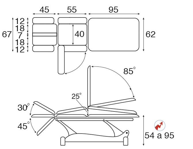 - Parte superior elevable 30º y abatible 45º, parte central elevable 25º y parte inferior elevable 85º.